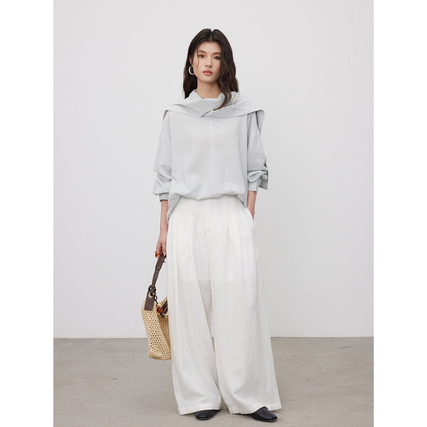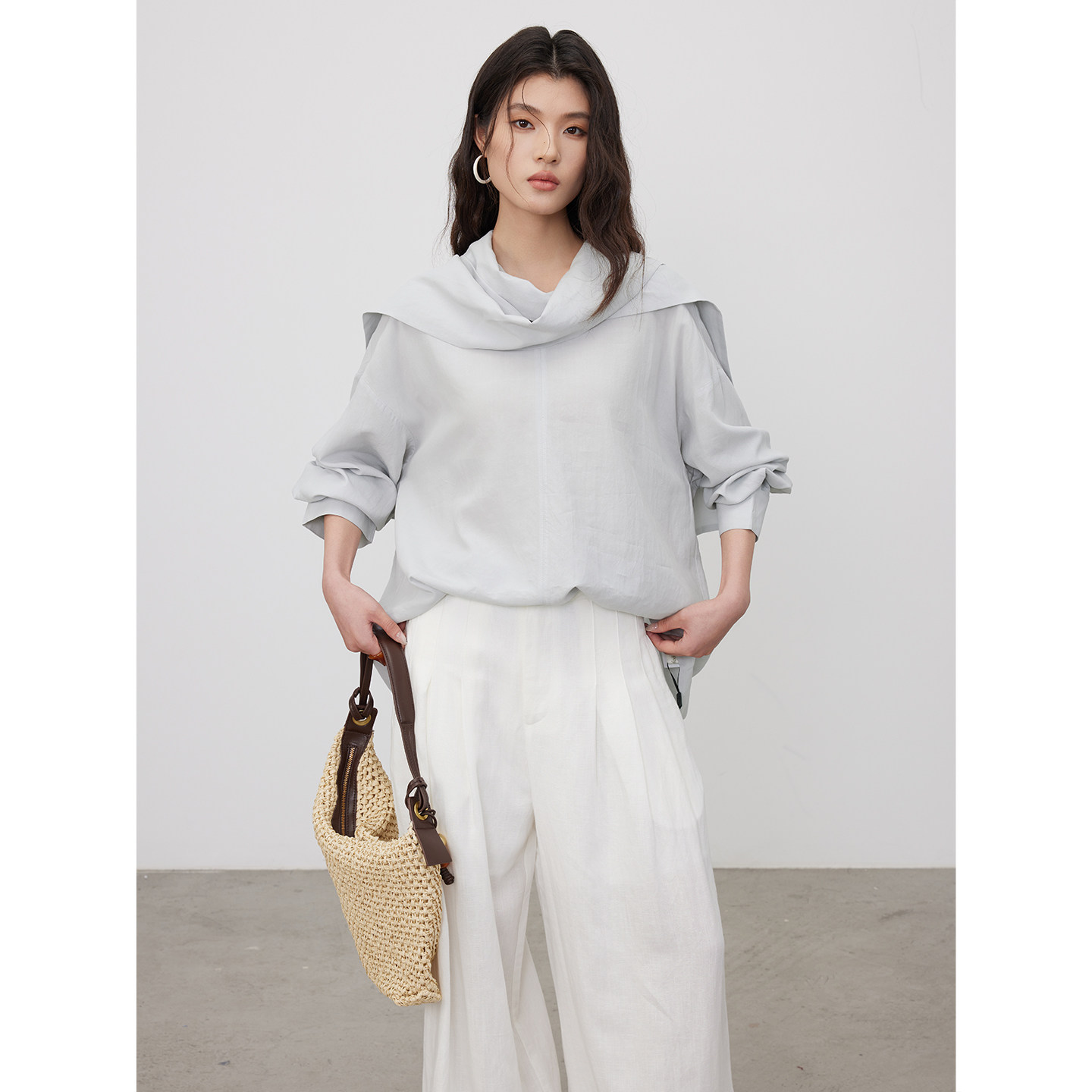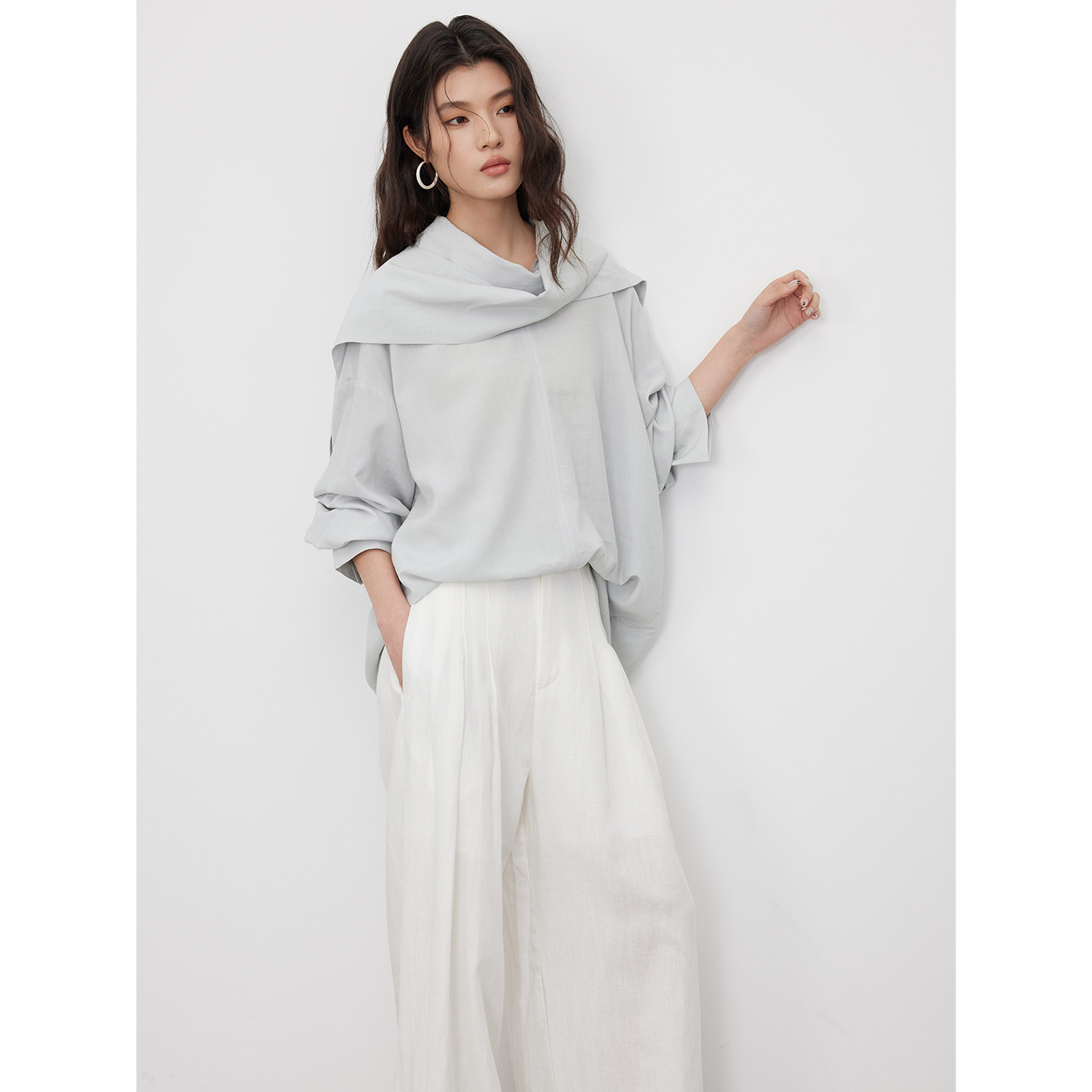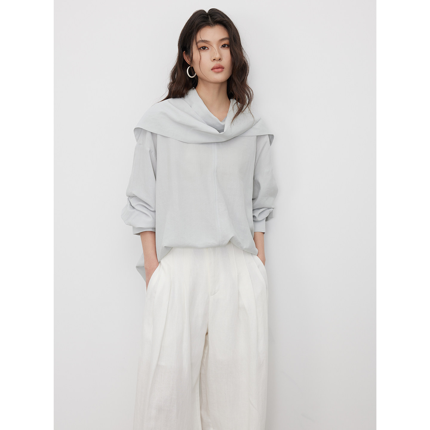 KEARA 雾蓝色飘带围巾领长袖衬衫女春新款高级感通勤宽松衬衣上衣