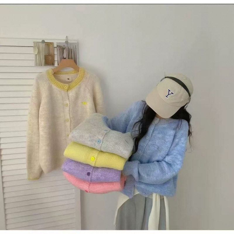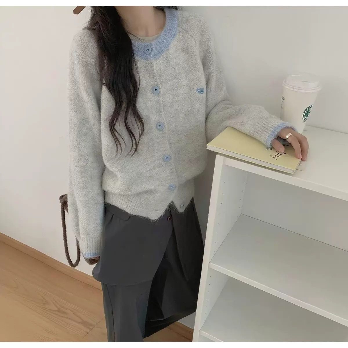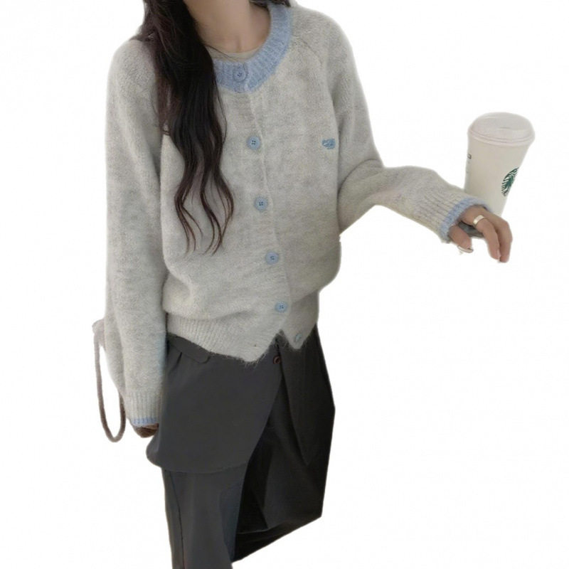 egg韩版软糯羊驼绒彩色拼接针织开衫女外搭圆领长袖开衫毛衣