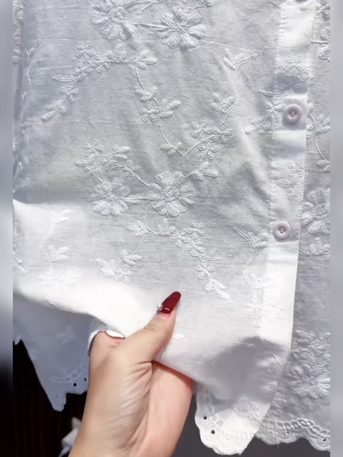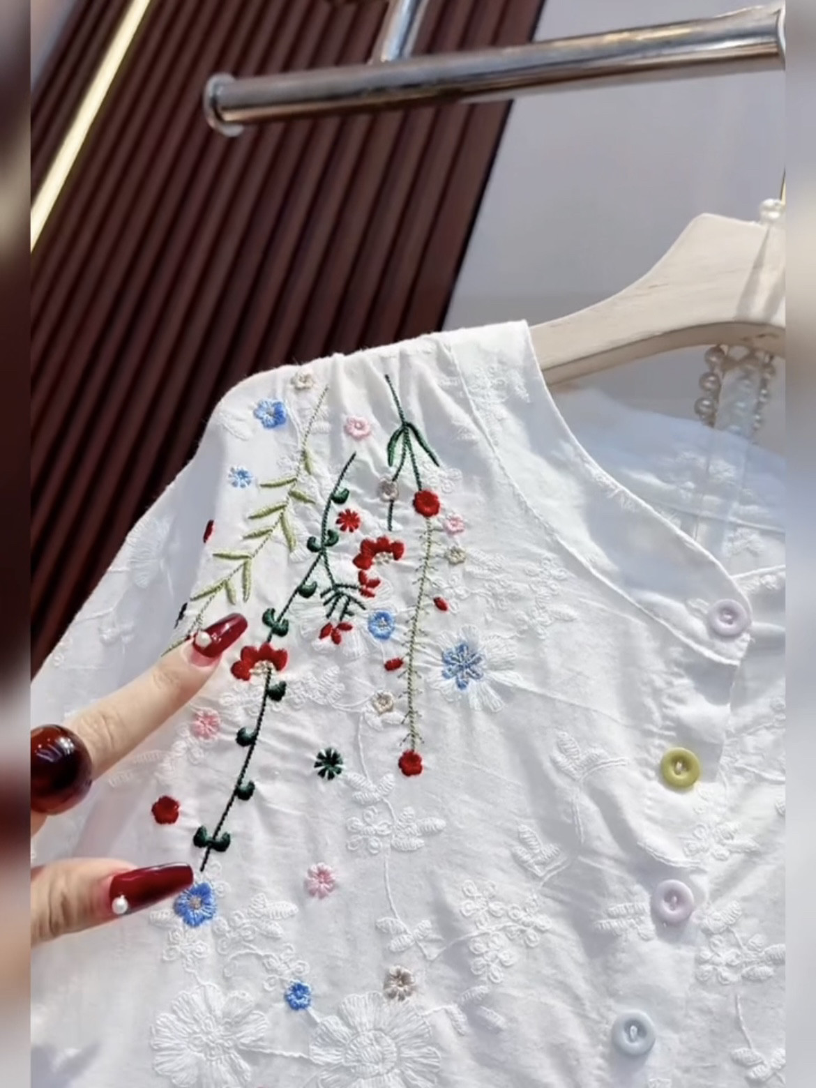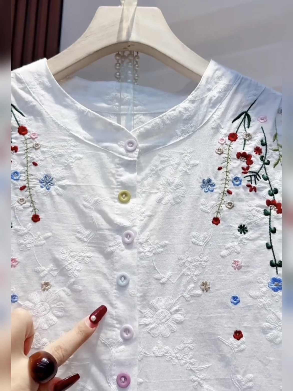 春夏大码纯棉刺绣长袖衬衫彩色扣子绣花简约上衣洋气减龄遮肉内搭