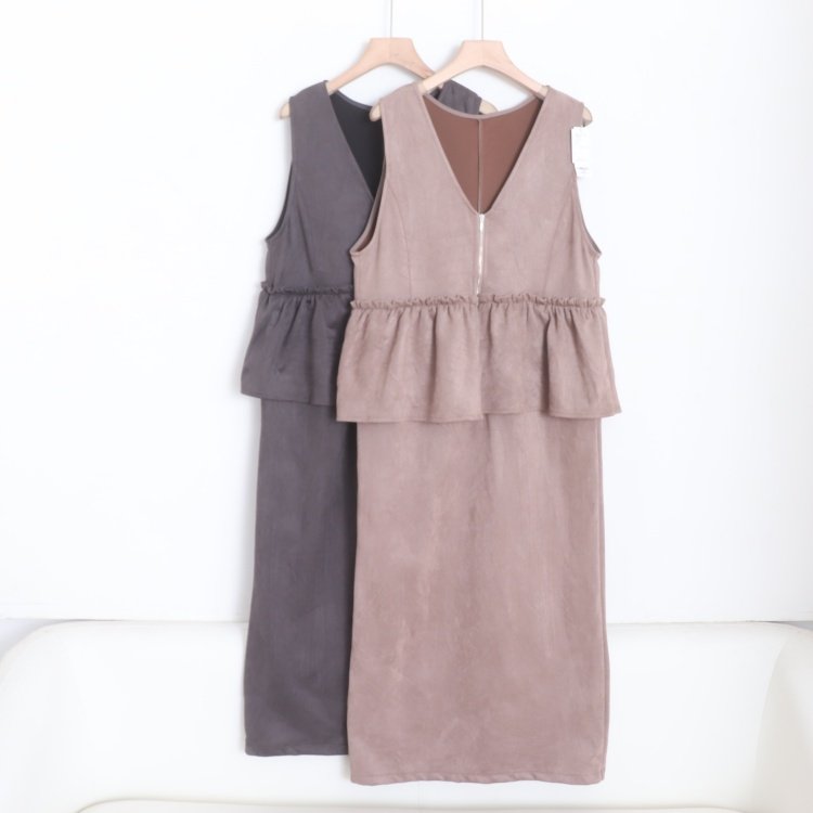 D15081日单新款门襟拉链V领套头松紧腰女麂皮绒优雅无袖连衣裙