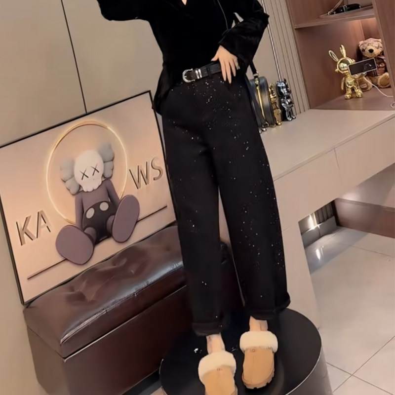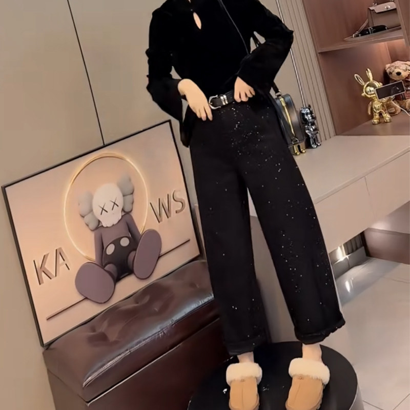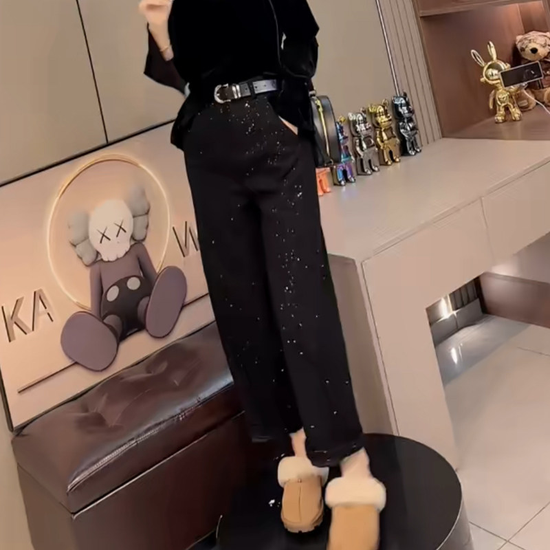 黑色欧货秋冬亮片满天星直筒宽松显瘦毛呢休闲百搭气质九分阔腿裤