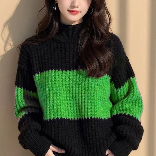 撞色粗线宽松毛衣2025新款冬季洋气高级独特针织慵懒打底上衣