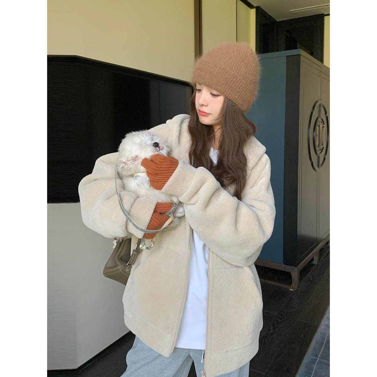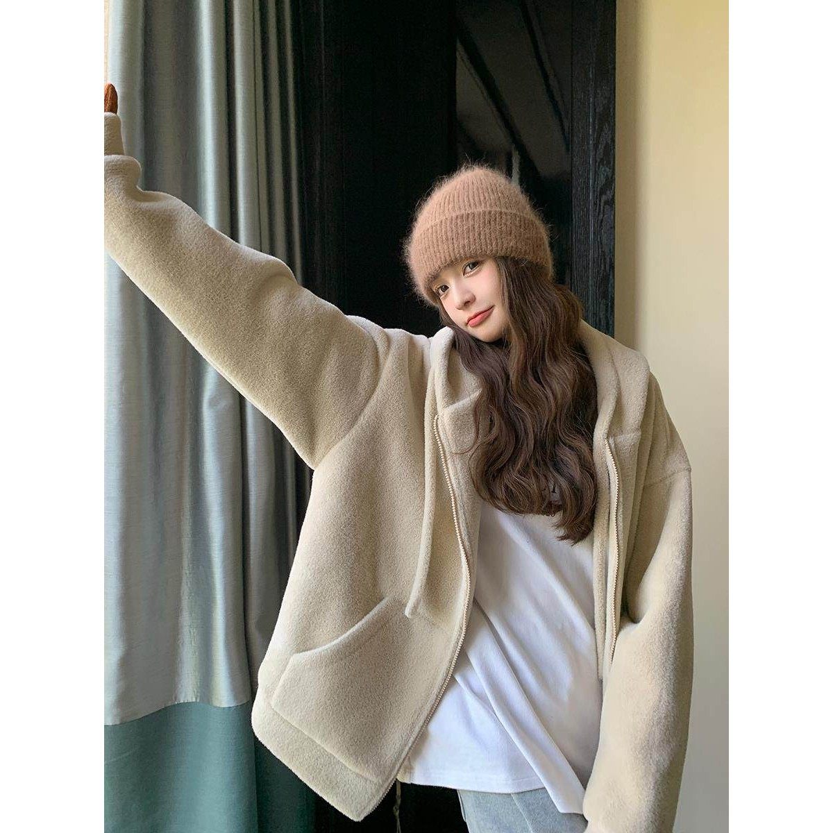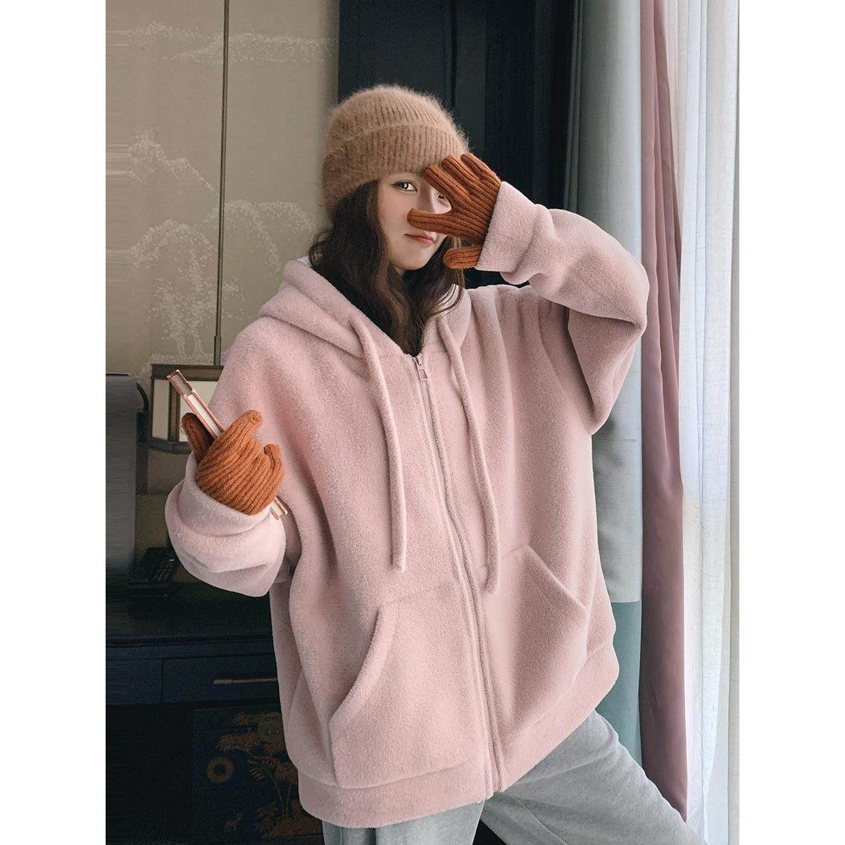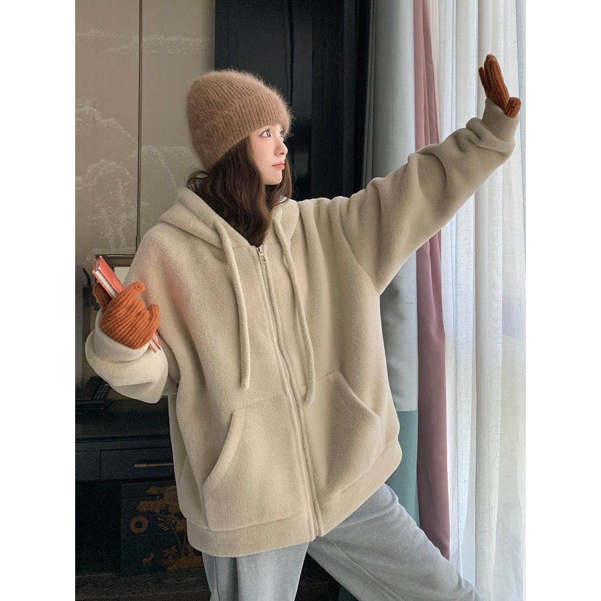 日本代购韩系羊羔毛连帽卫衣外套女冬2025慵懒风加厚拉炼开衫上衣