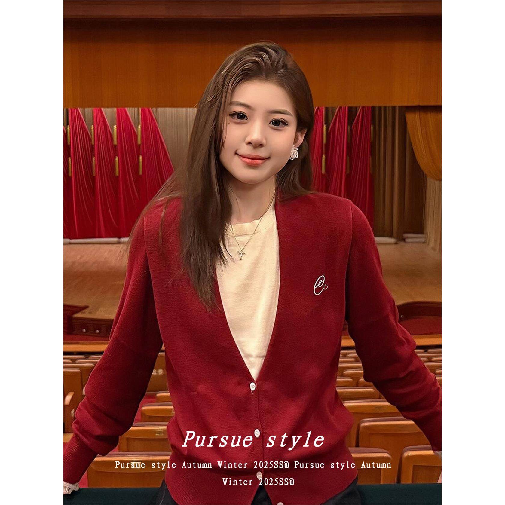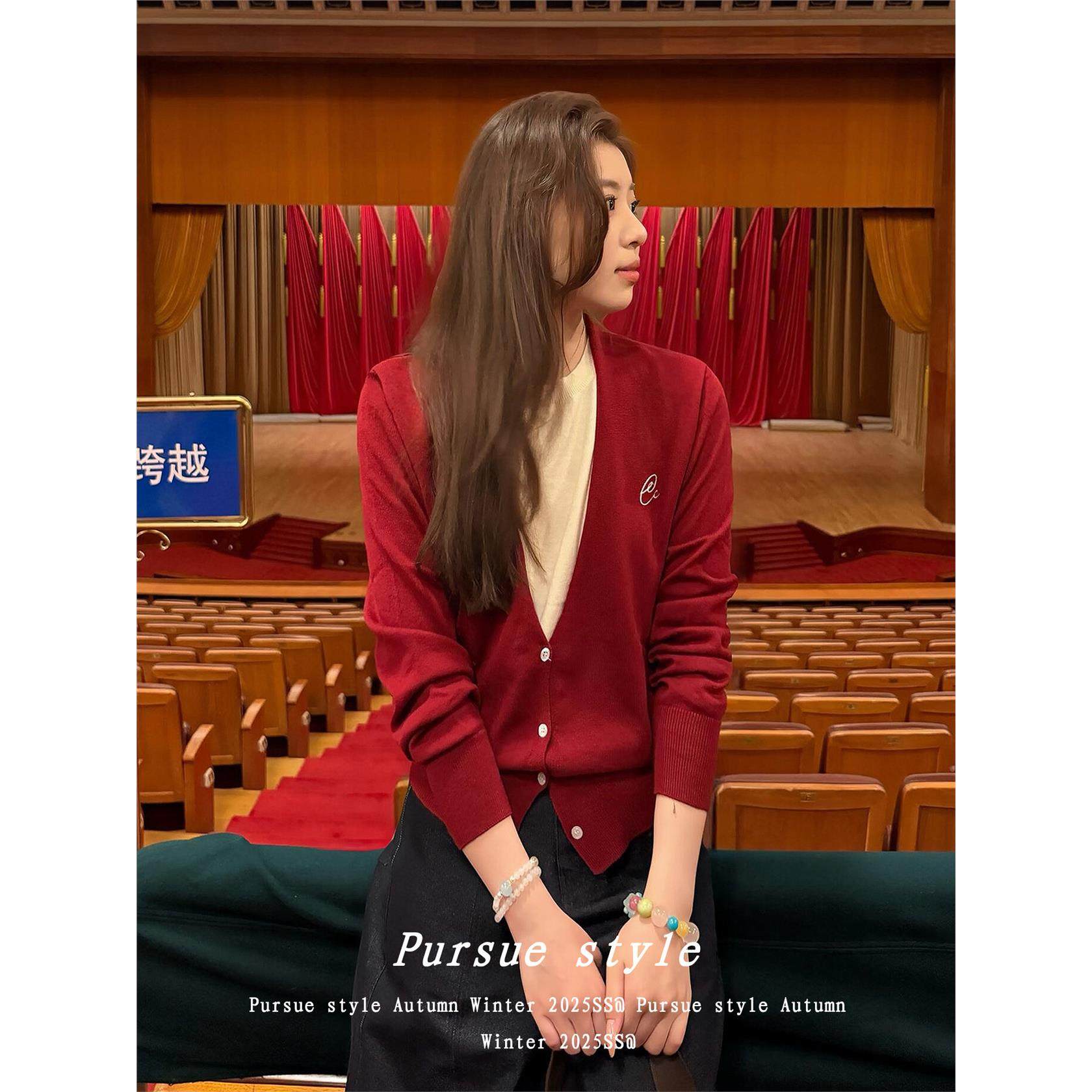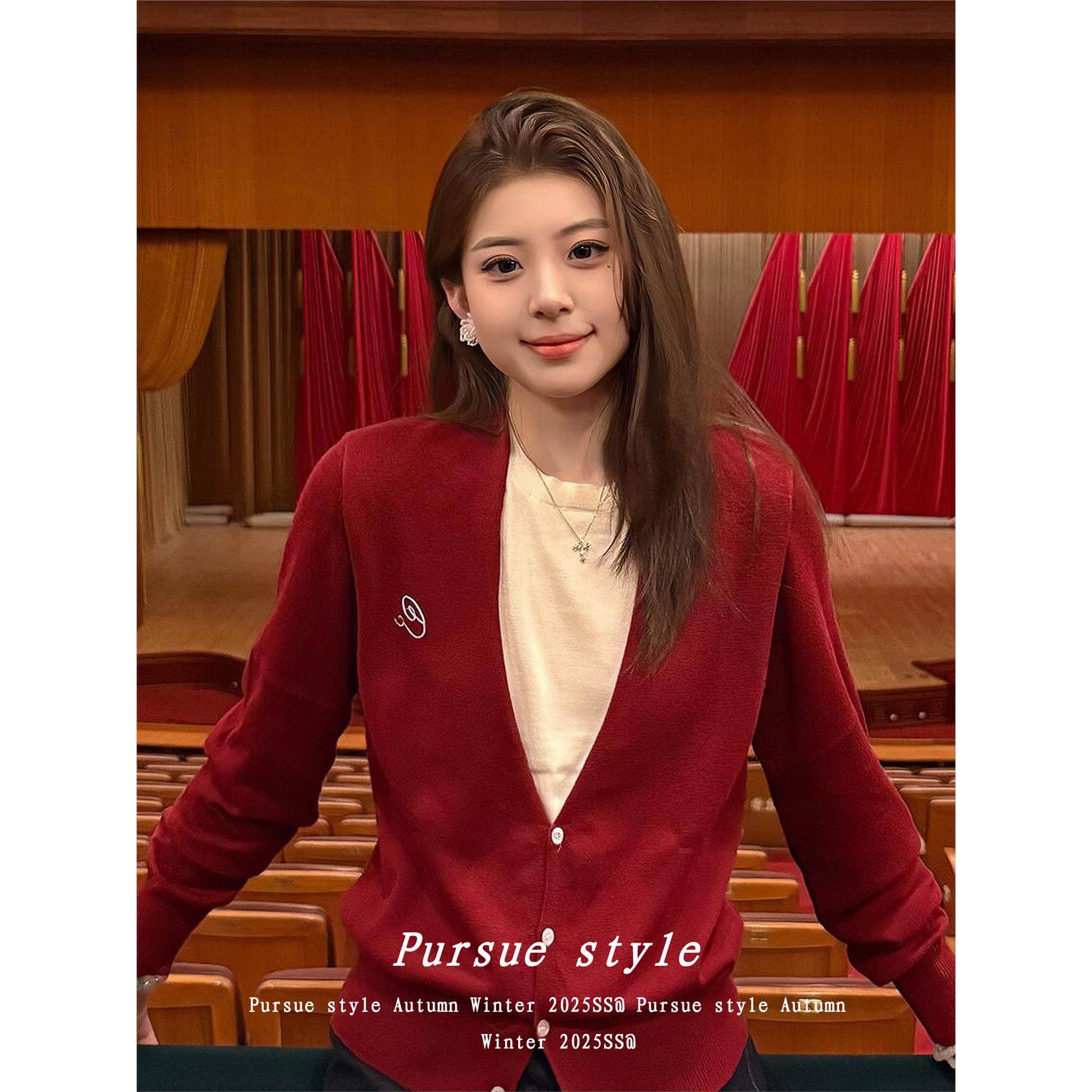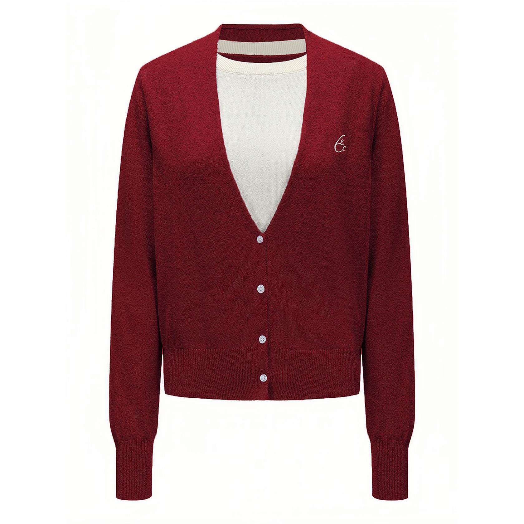 【焦点自显】美式覆古针织开衫女秋季假两件毛衣本命年红色上衣