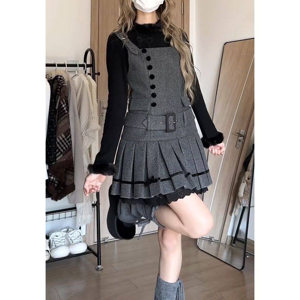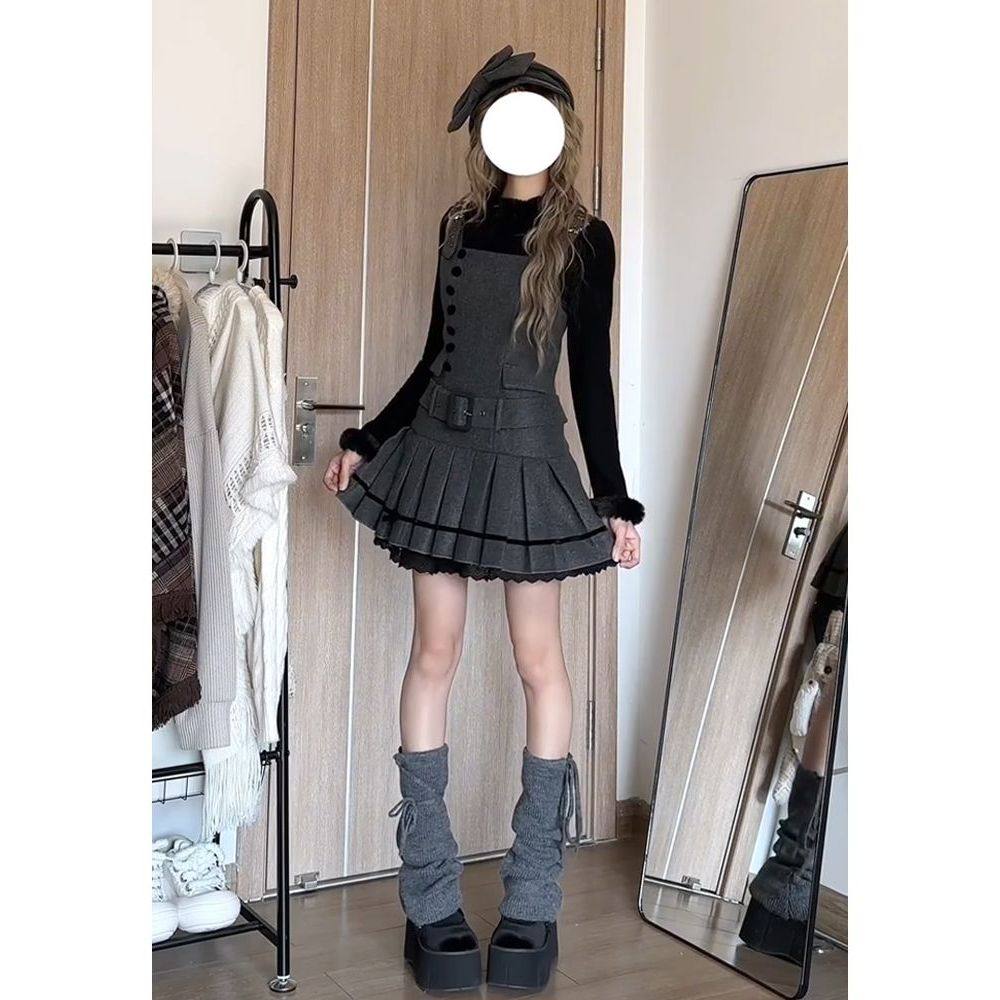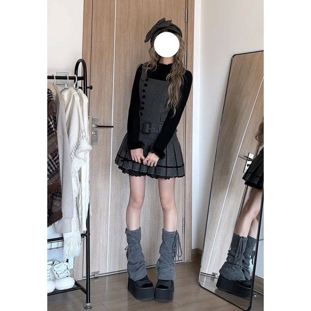 来信与诗 日系甜酷学院风约会穿搭单排扣背带裙毛边上衣冬季套装