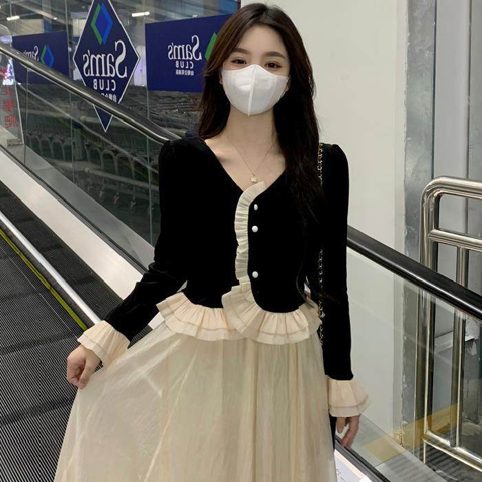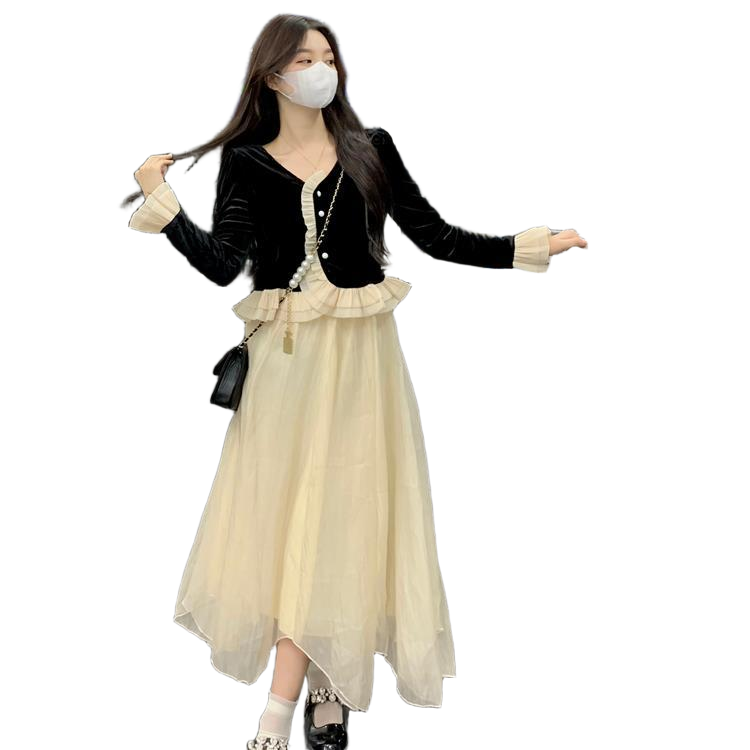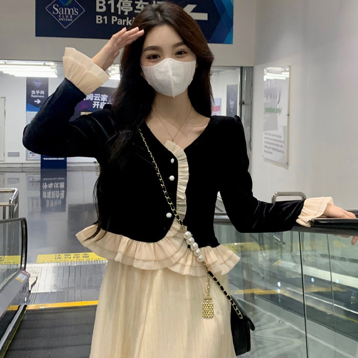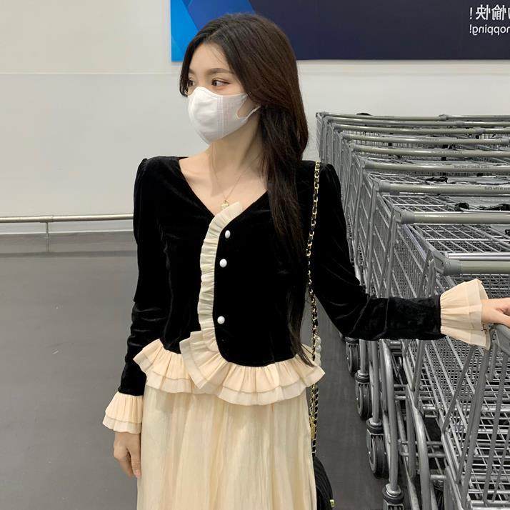 气质短款丝绒衬衫套装女飘逸秋冬季新款仙女系显瘦半身裙子两件套