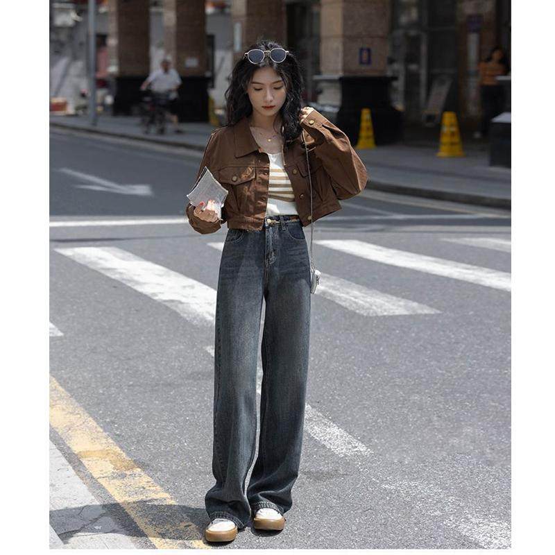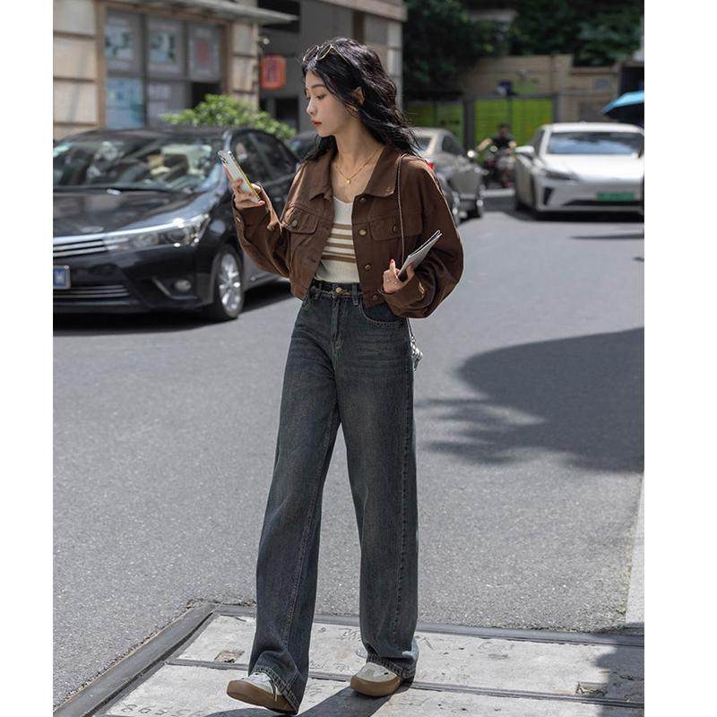 春秋季气质直筒女牛仔棉短外套显瘦时尚港风咖啡色小个子翻领上衣