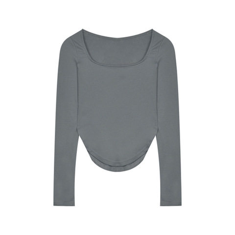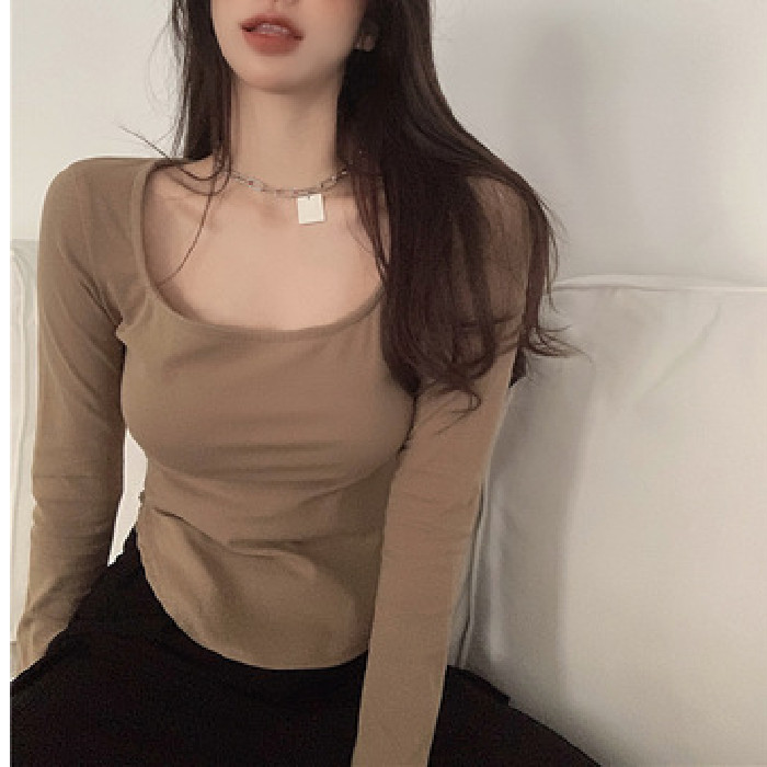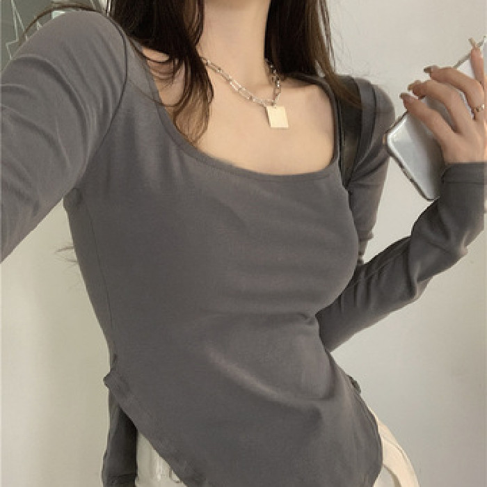 T恤女长袖早春新款U领露锁骨不规则下摆夏天薄款打底衫修身上衣潮
