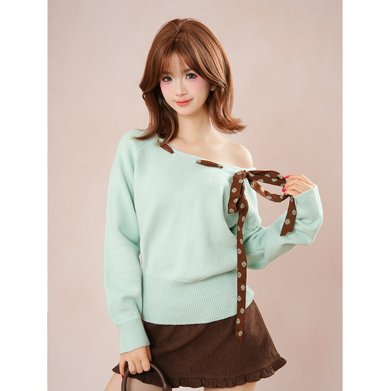 酪梨奶绿 韩系甜美一字肩波点绑带明线装饰上衣木耳花边半裙套装