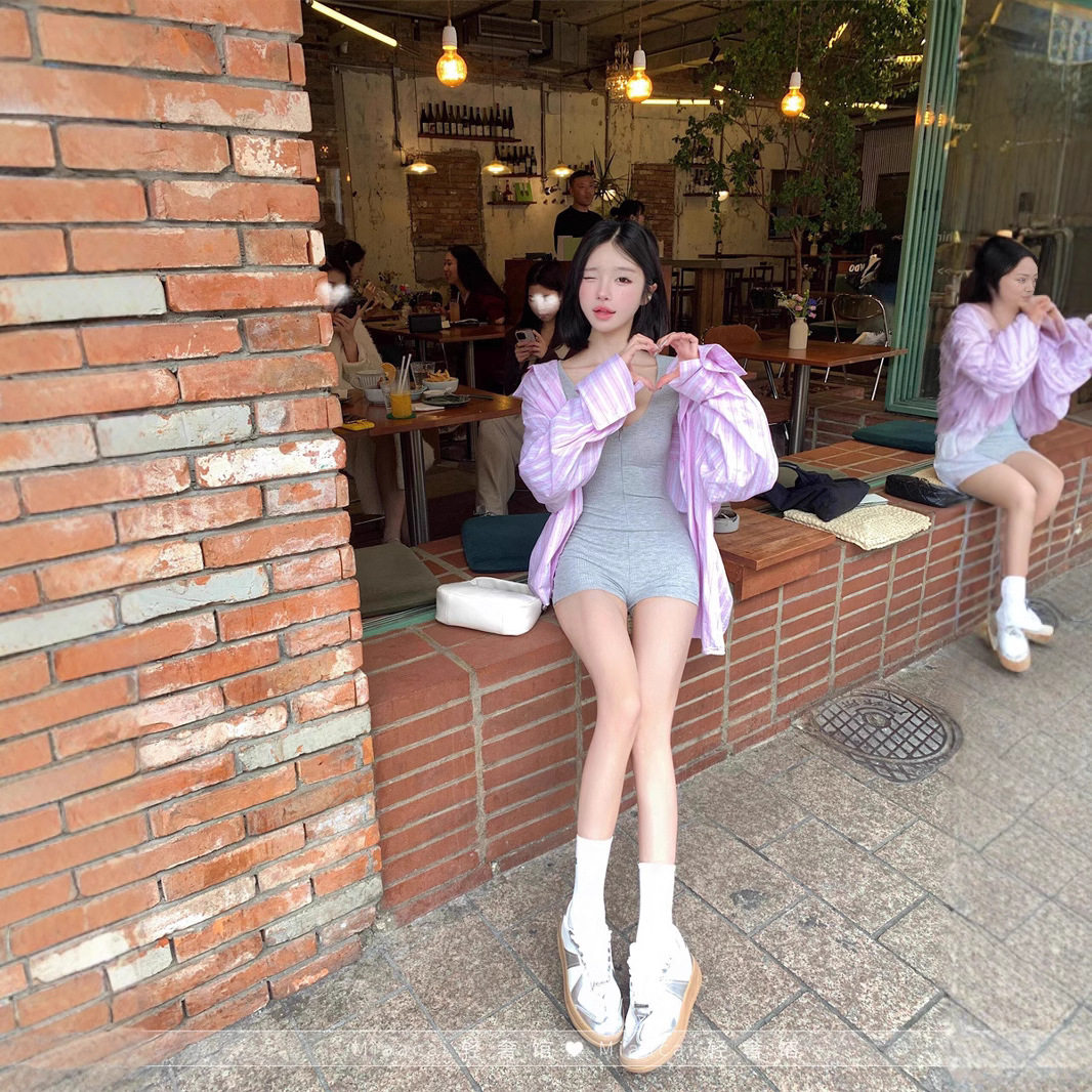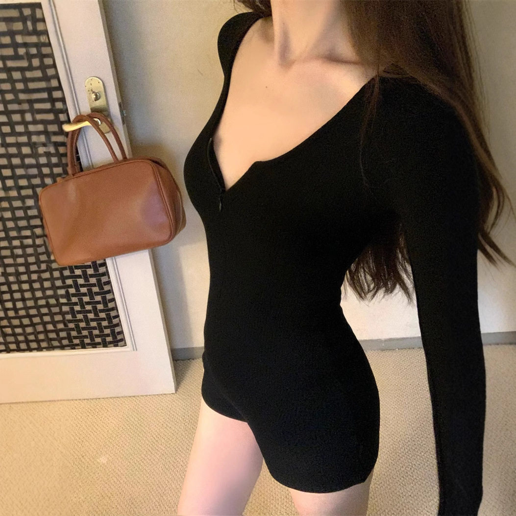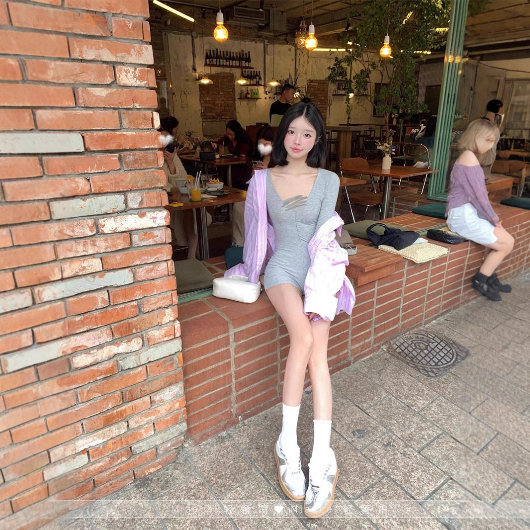 纯欲风长袖连体裤女春季高腰修身显瘦休闲连衣短裤