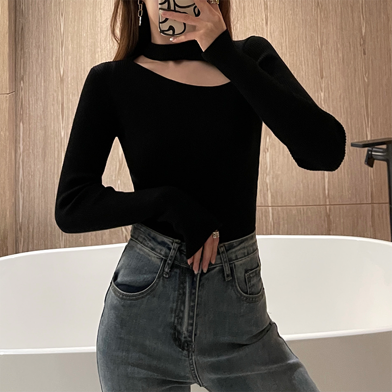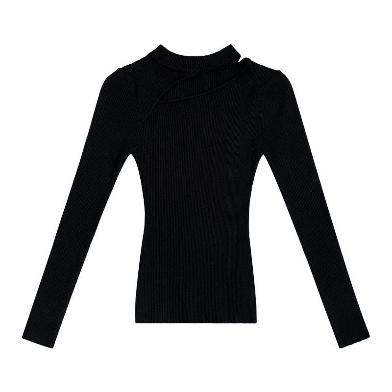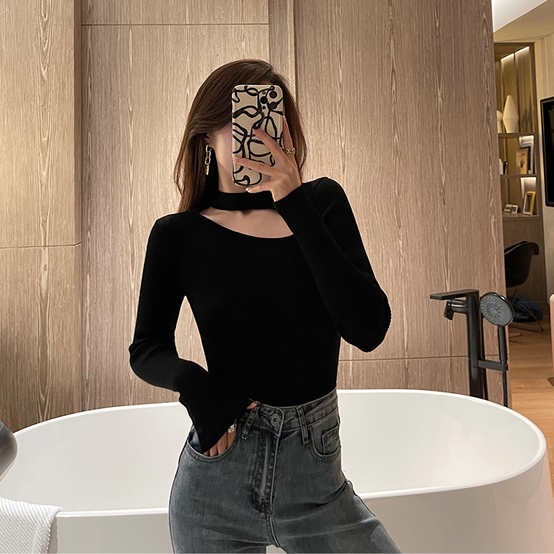 黑色镂空打底衫女秋冬设计感小众毛衣内搭锁骨挂脖针织衫心机上衣
