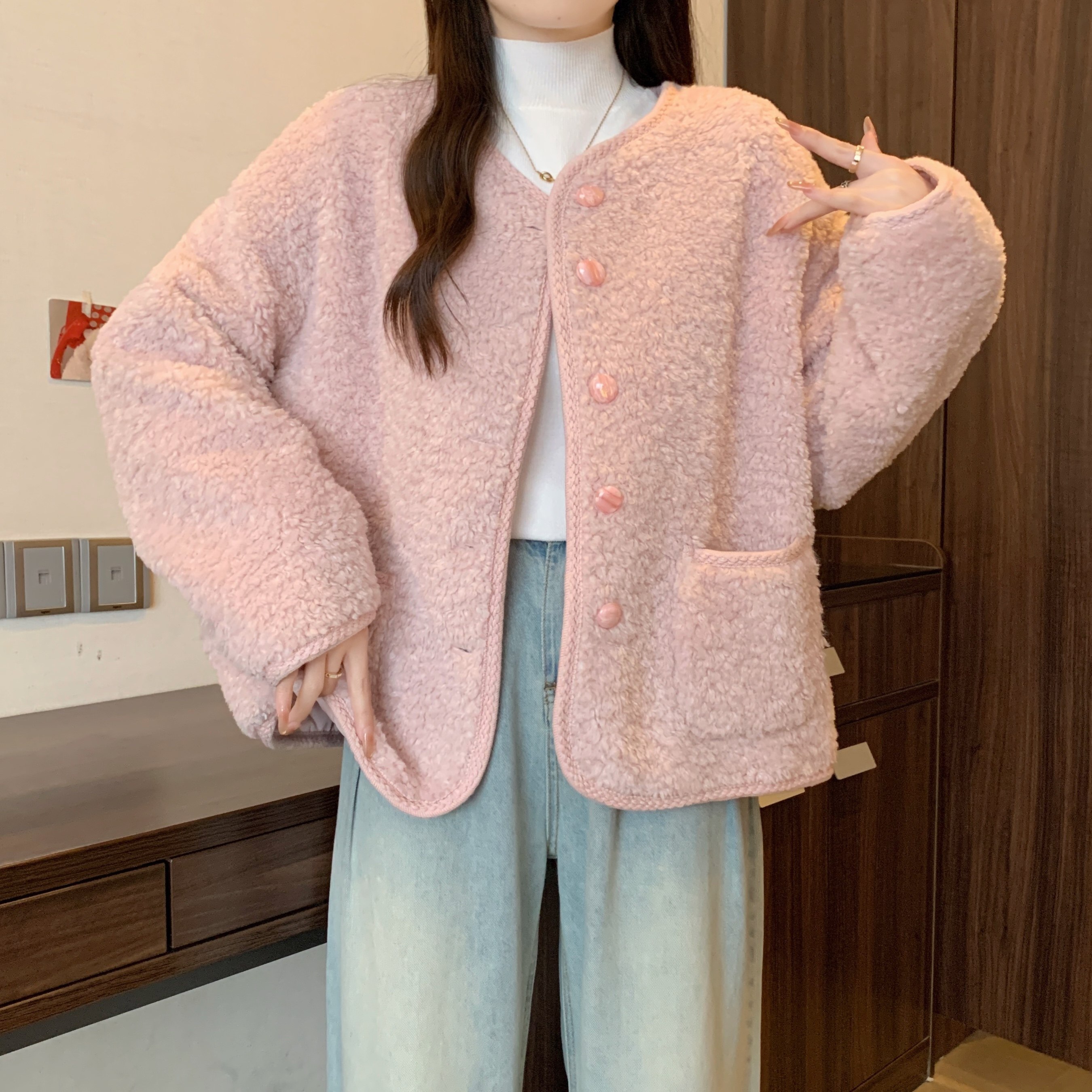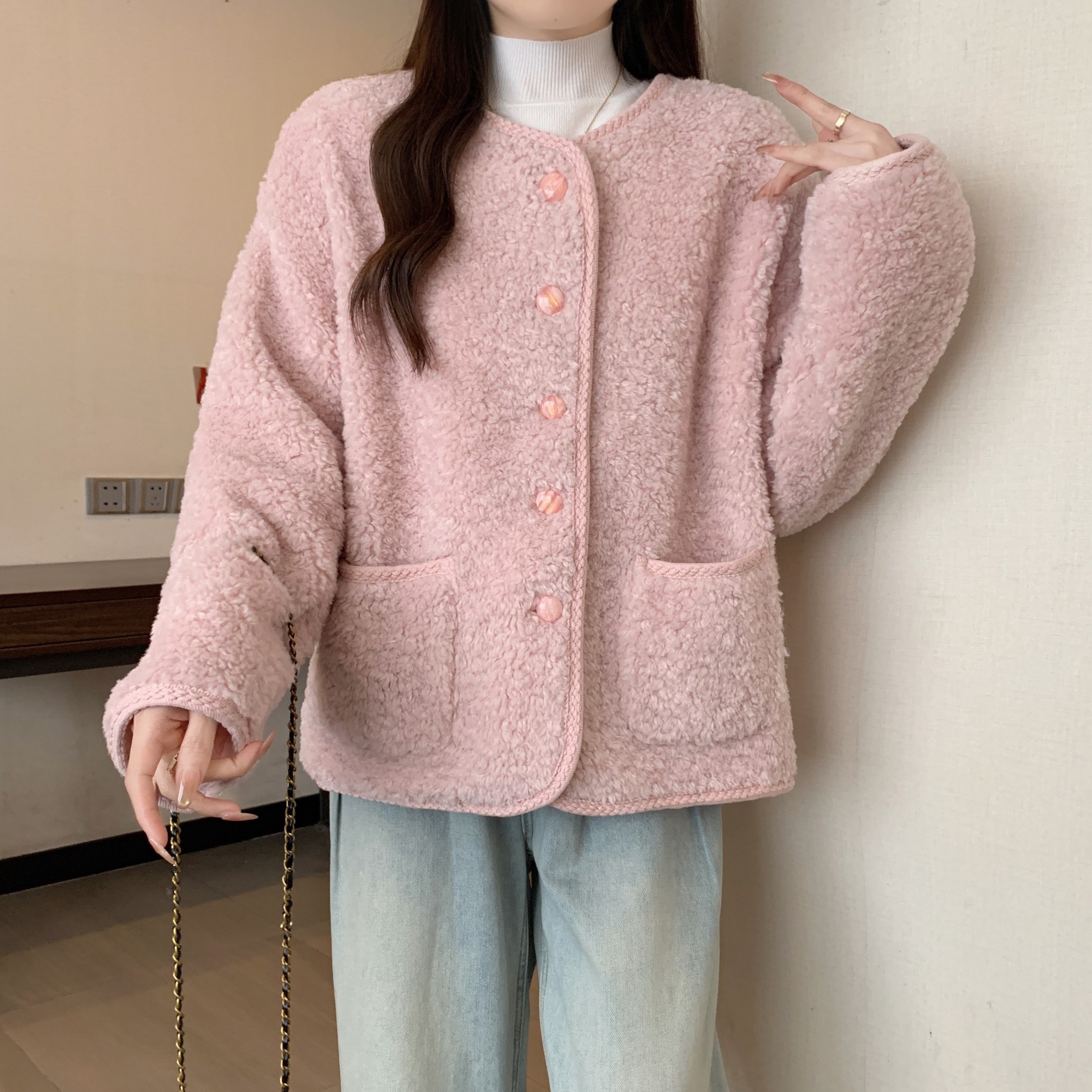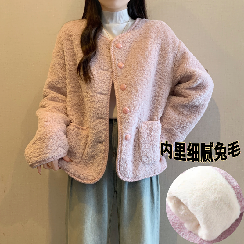 实拍~粉色羊羔毛外套女2025冬新款软糯加厚短款摇粒绒小香风上衣