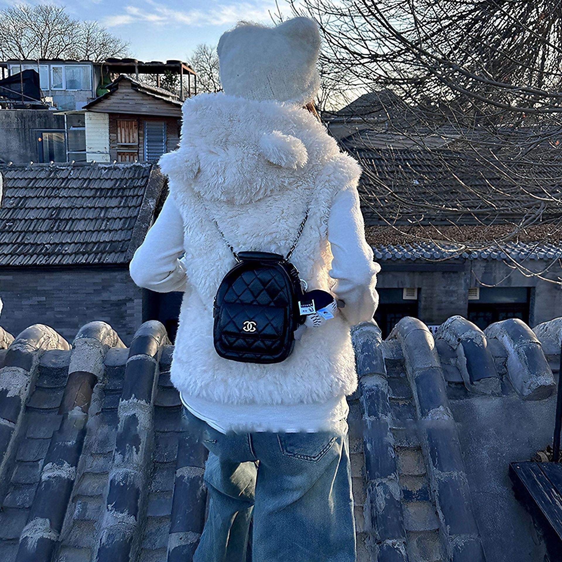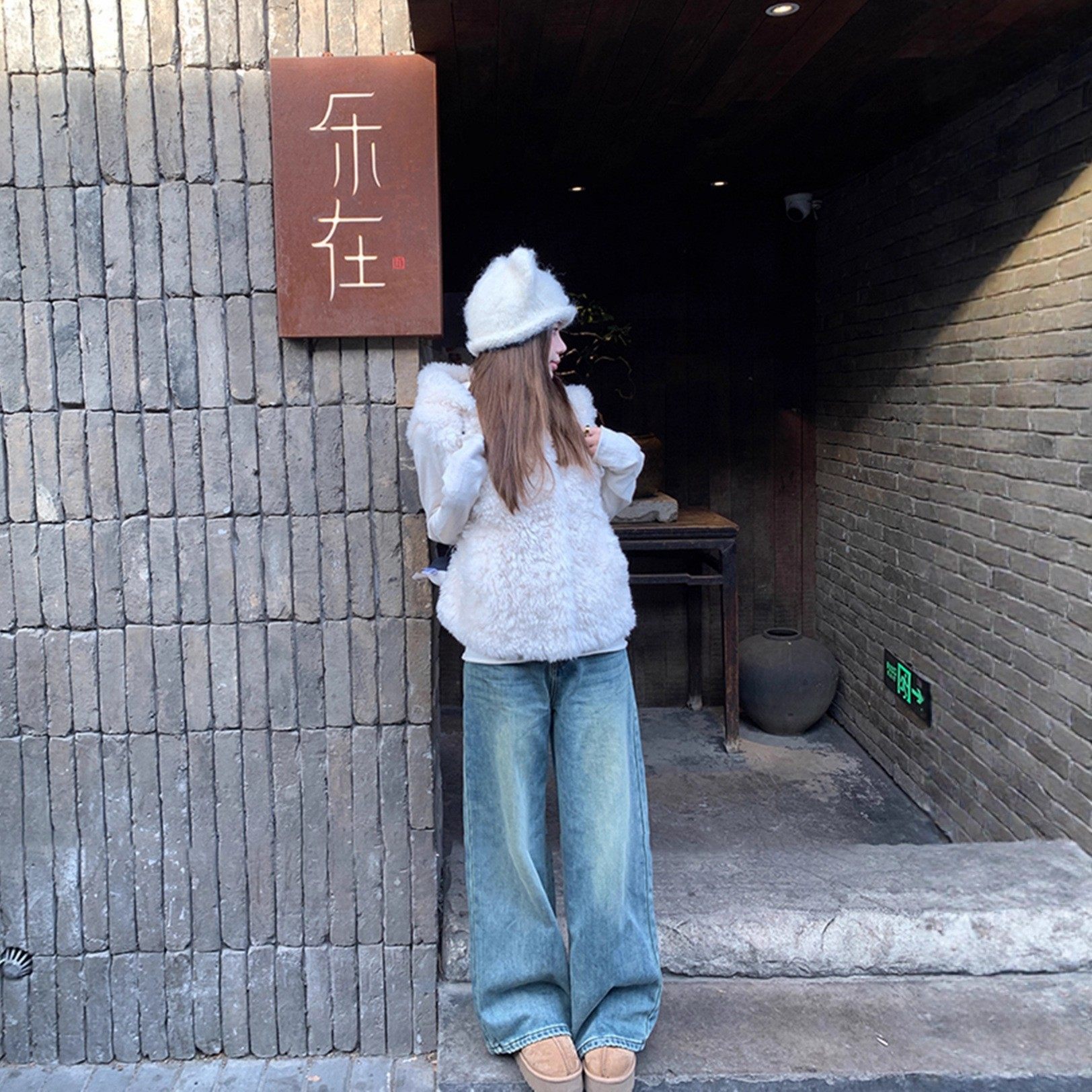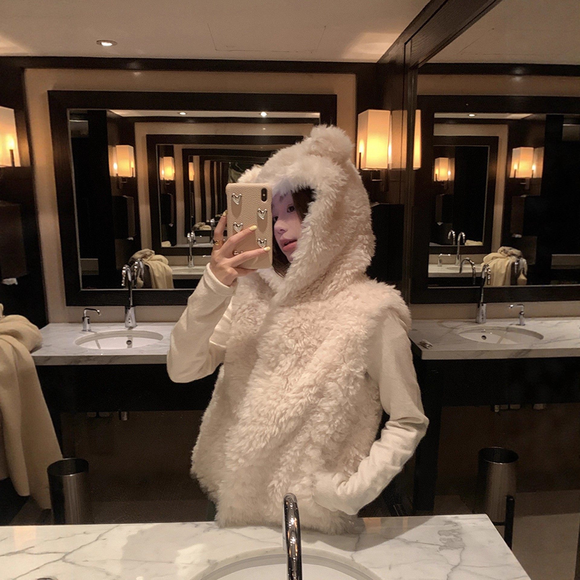 小熊耳朵连帽马甲女秋冬2025米白色羊羔毛外套小个子环保皮草坎肩