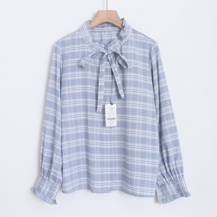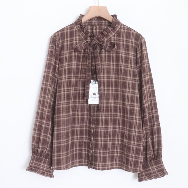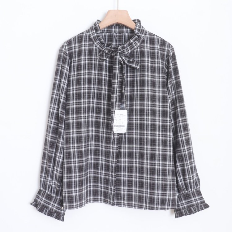 首页> 女装> D16098日单新款花边抽绳系带领隐形扣女文艺甜美格子喇叭袖衬衫