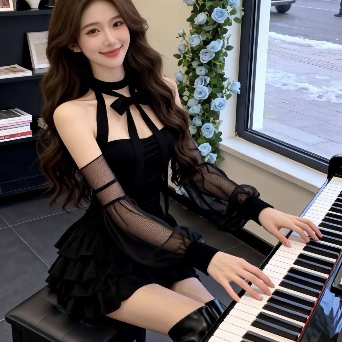 轻奢时尚气质高级千金风黑色圆领挂脖露肩网纱褶皱长袖收腰连衣裙