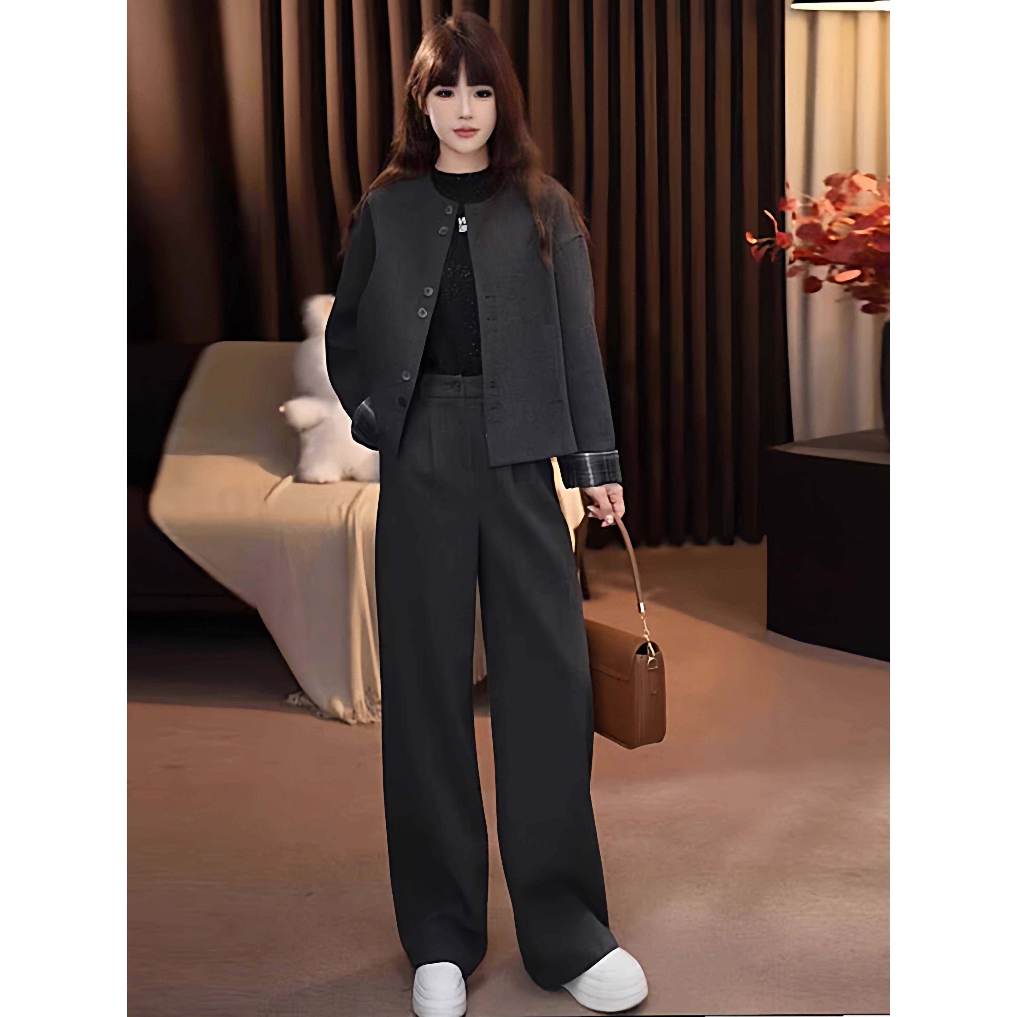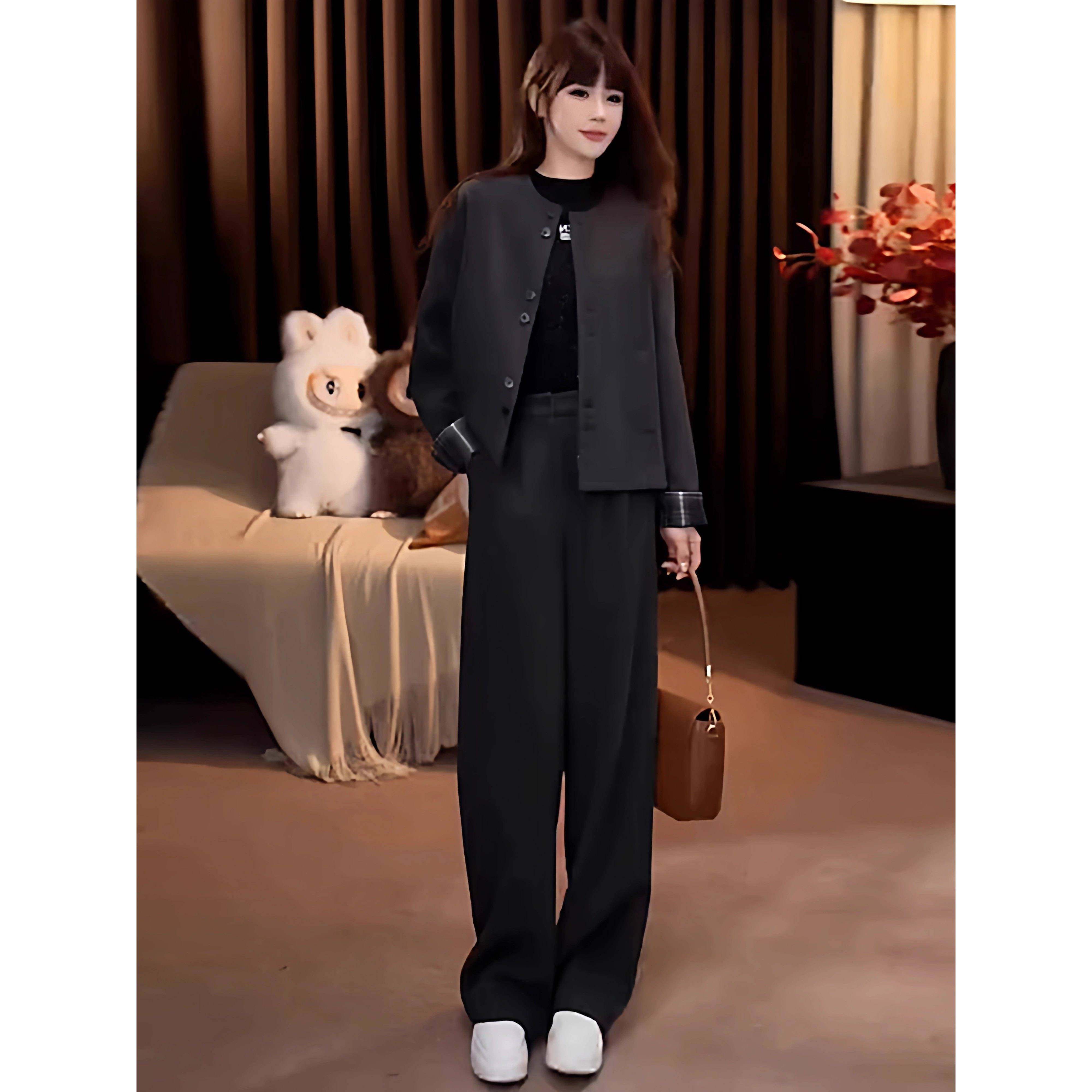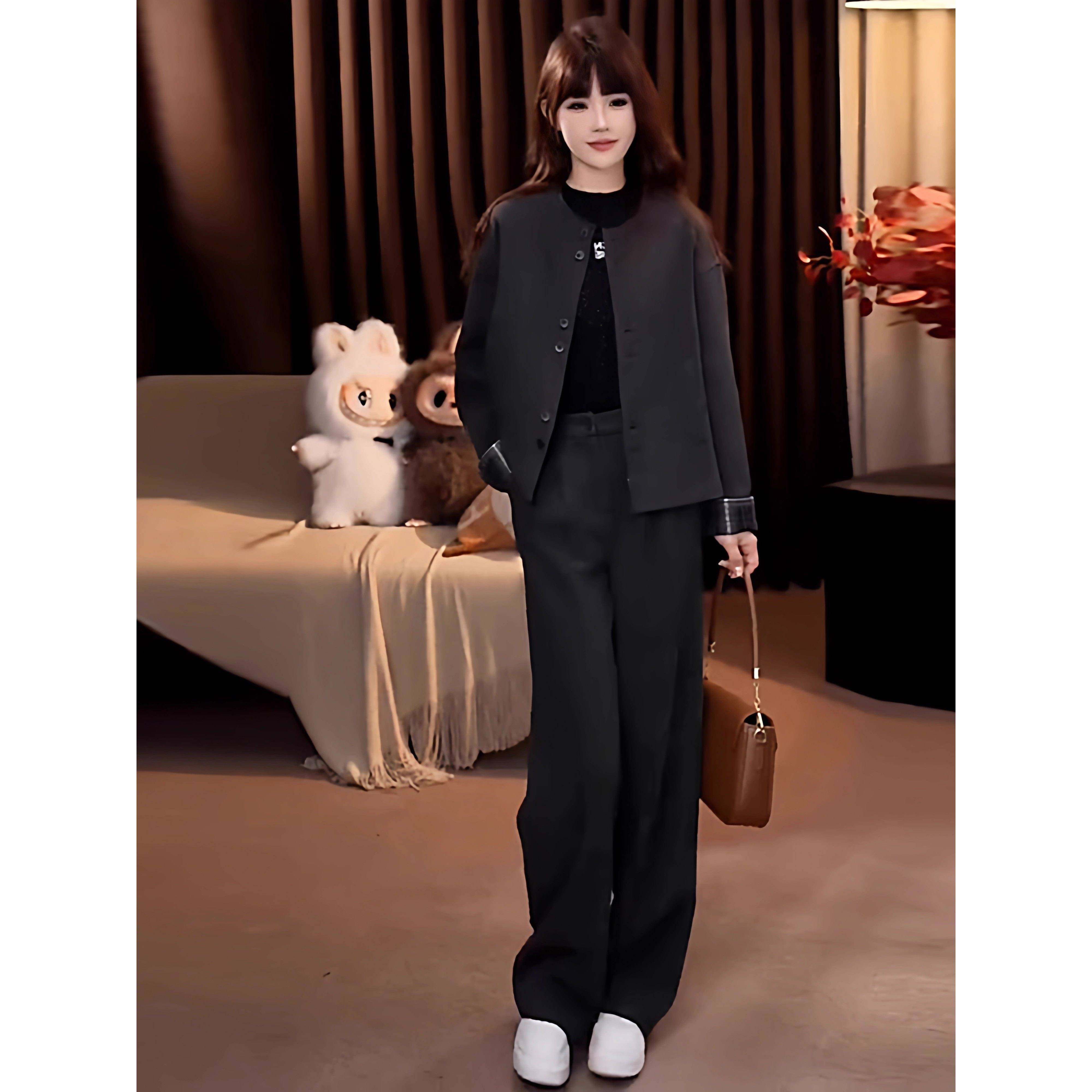 首页> 女装> 香港代购时尚套装女秋新款显瘦格子拼接圆领短款外套直简裤两件套