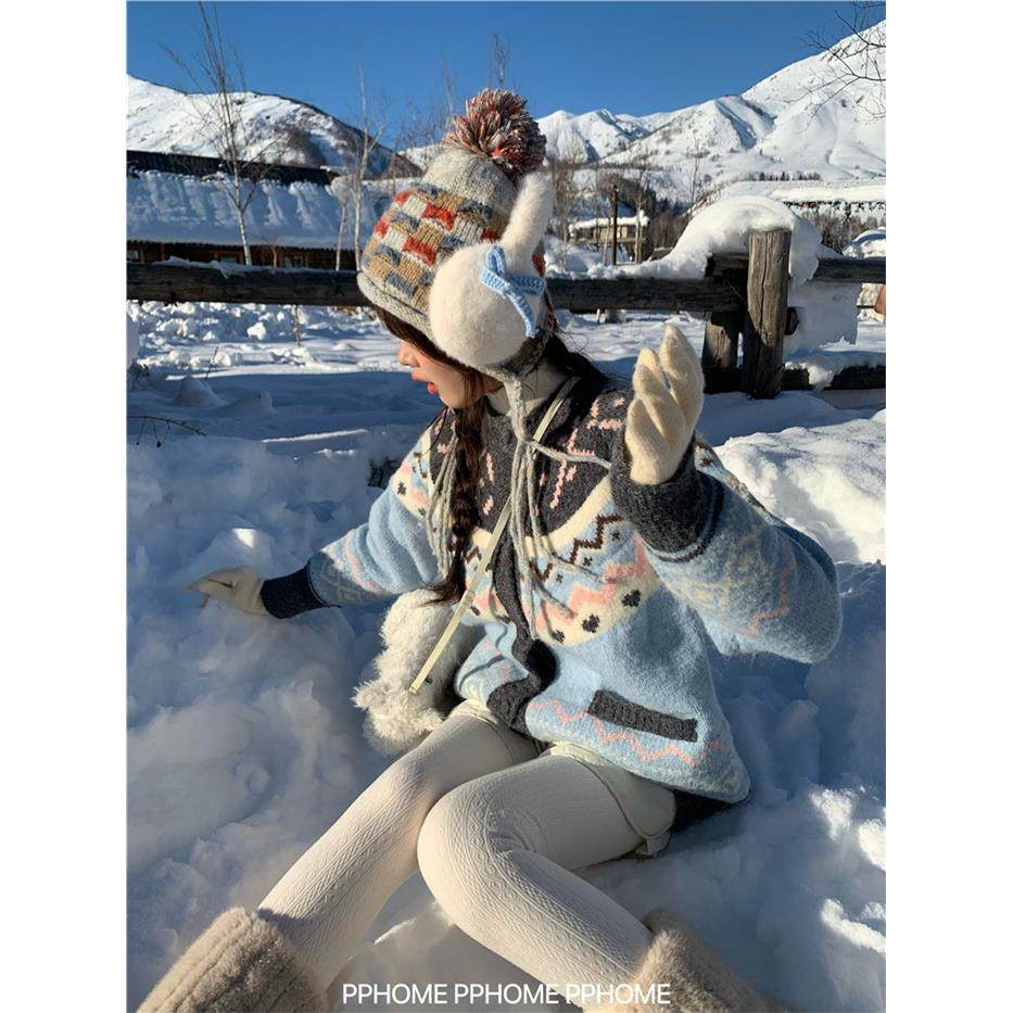 PPHOME自制~冬日初恋 粉蓝费尔岛毛衣外套冬季重工加厚宽松开衫女