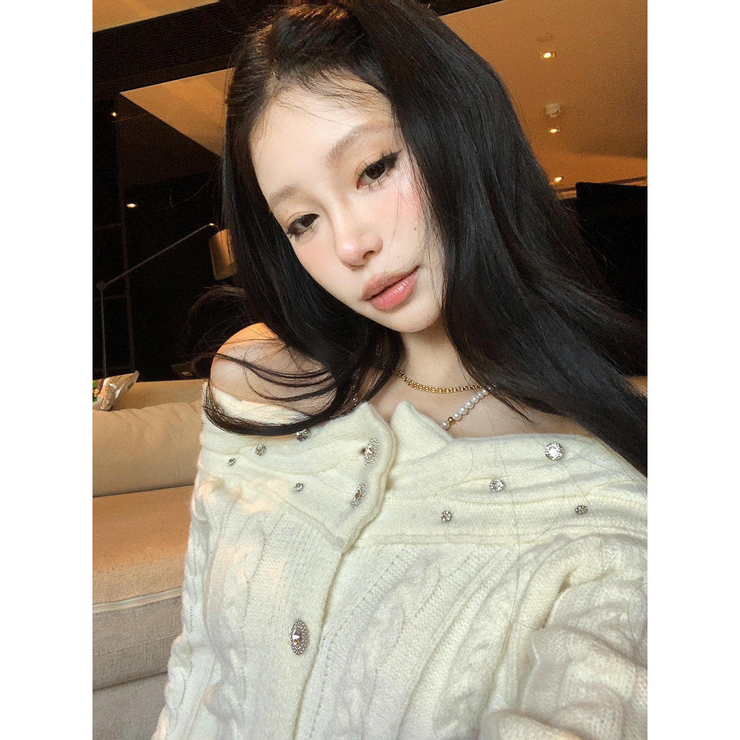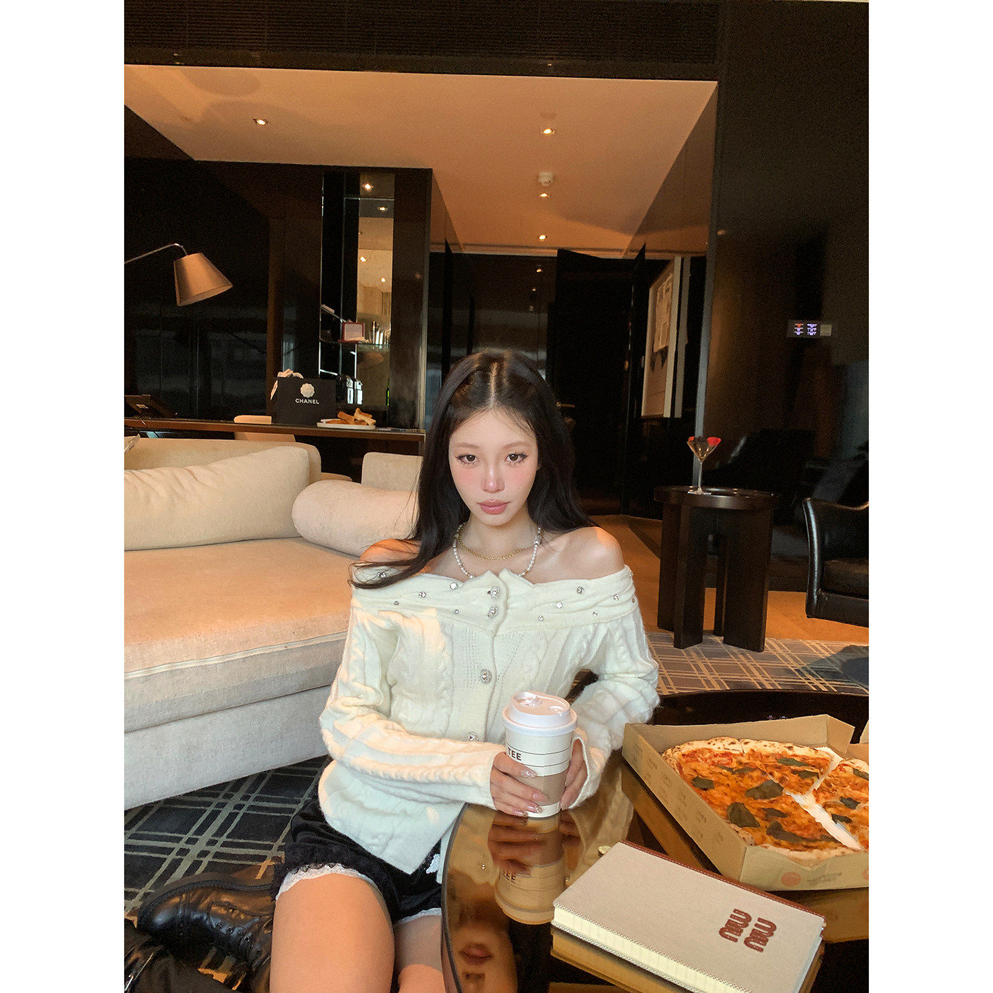 Pinksoya甜辣一字肩麻花软糯毛衣女2025冬季新款收腰显瘦开衫上衣