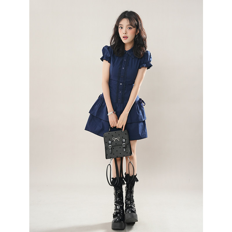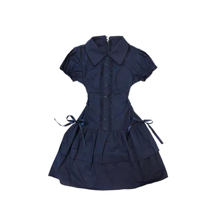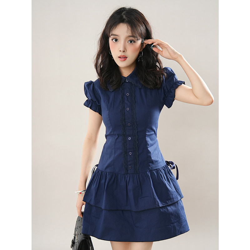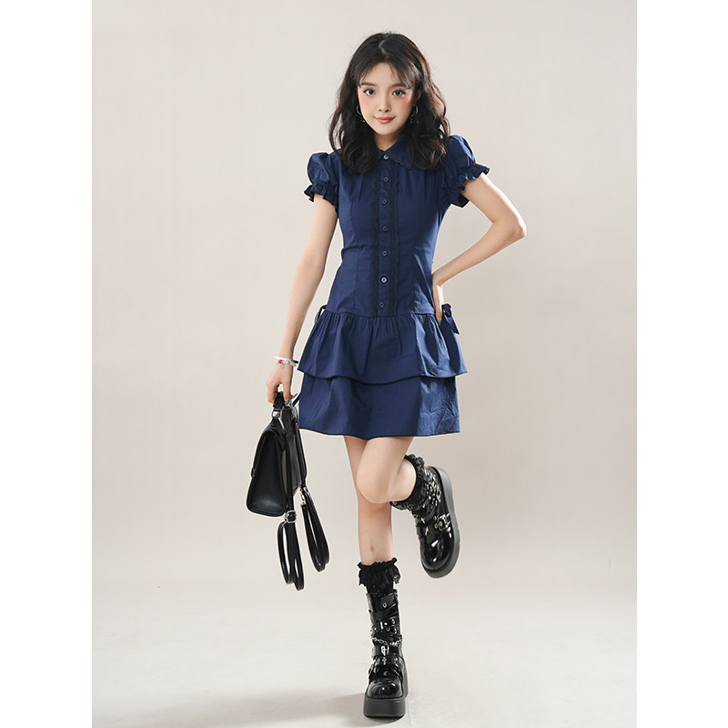 vintage复古穿搭学院风蕾丝边拼接蓝色复古衬衫连衣裙古着风短裙
