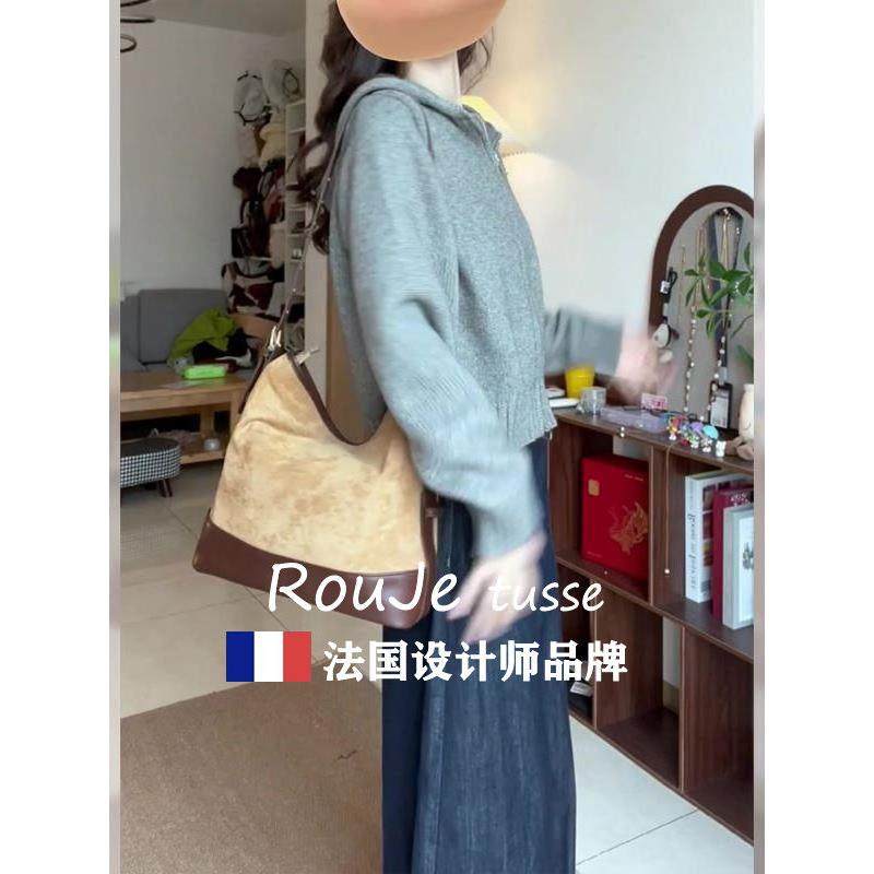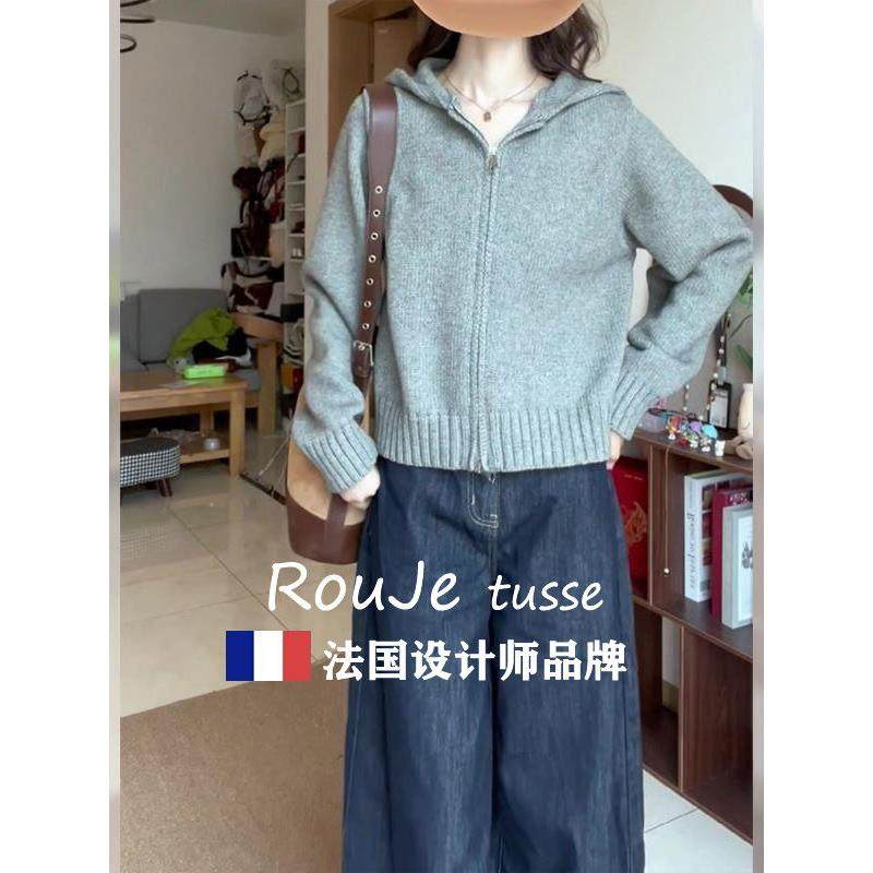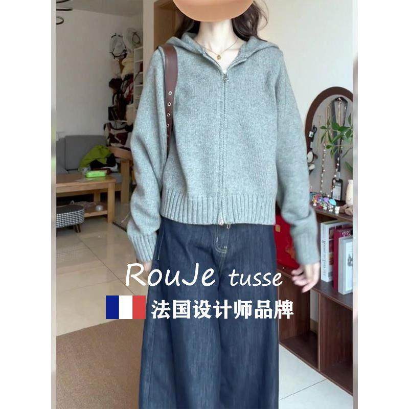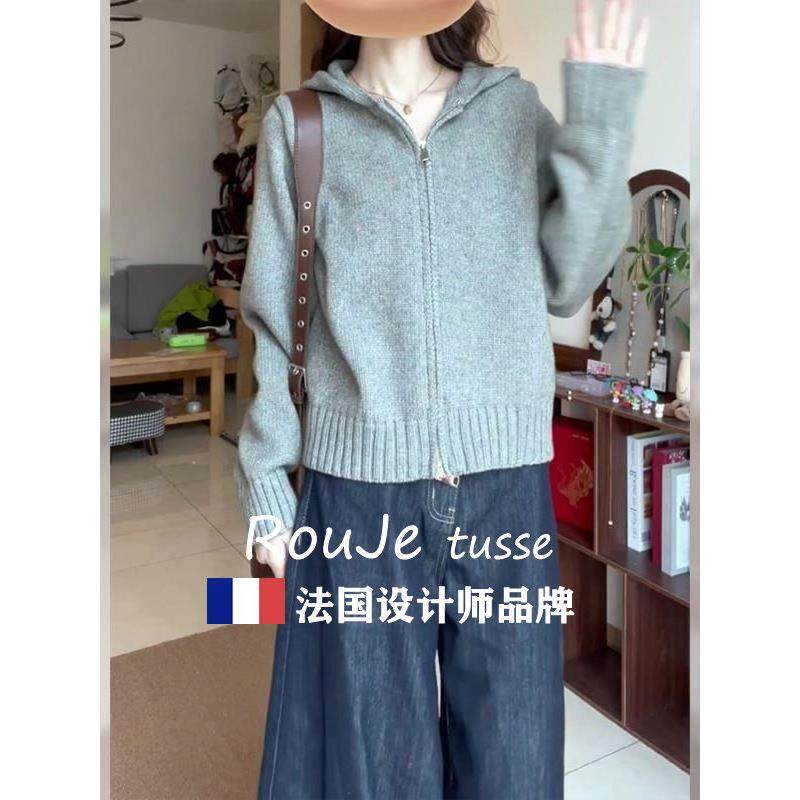 Rouje tusse高级时尚黑色连帽羊毛针织外套宽松显瘦卫衣羊绒开衫