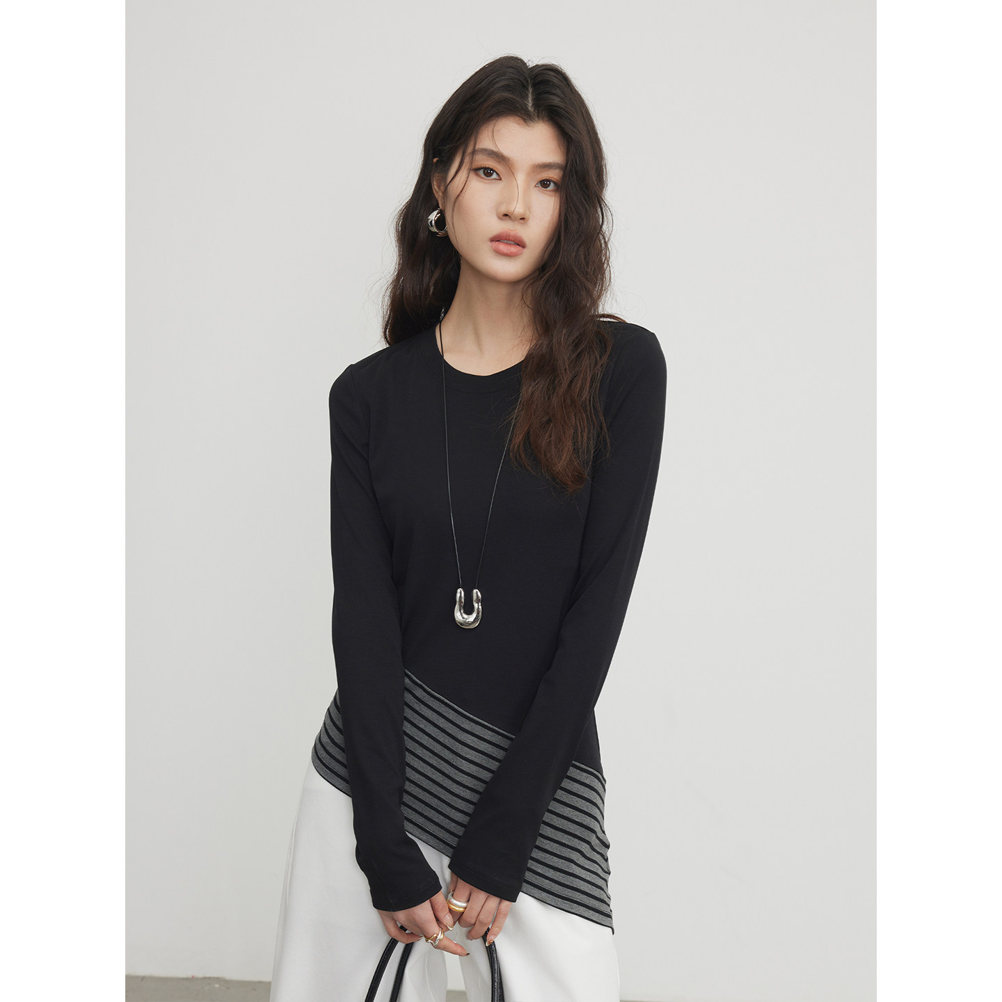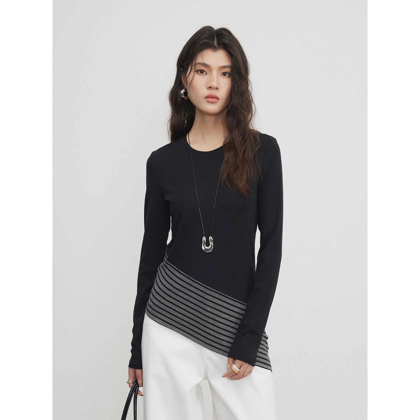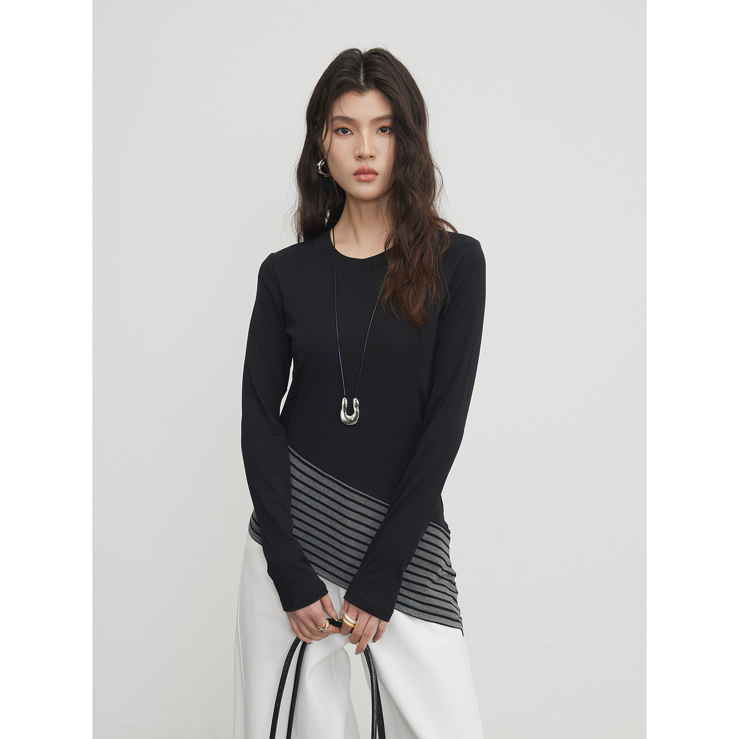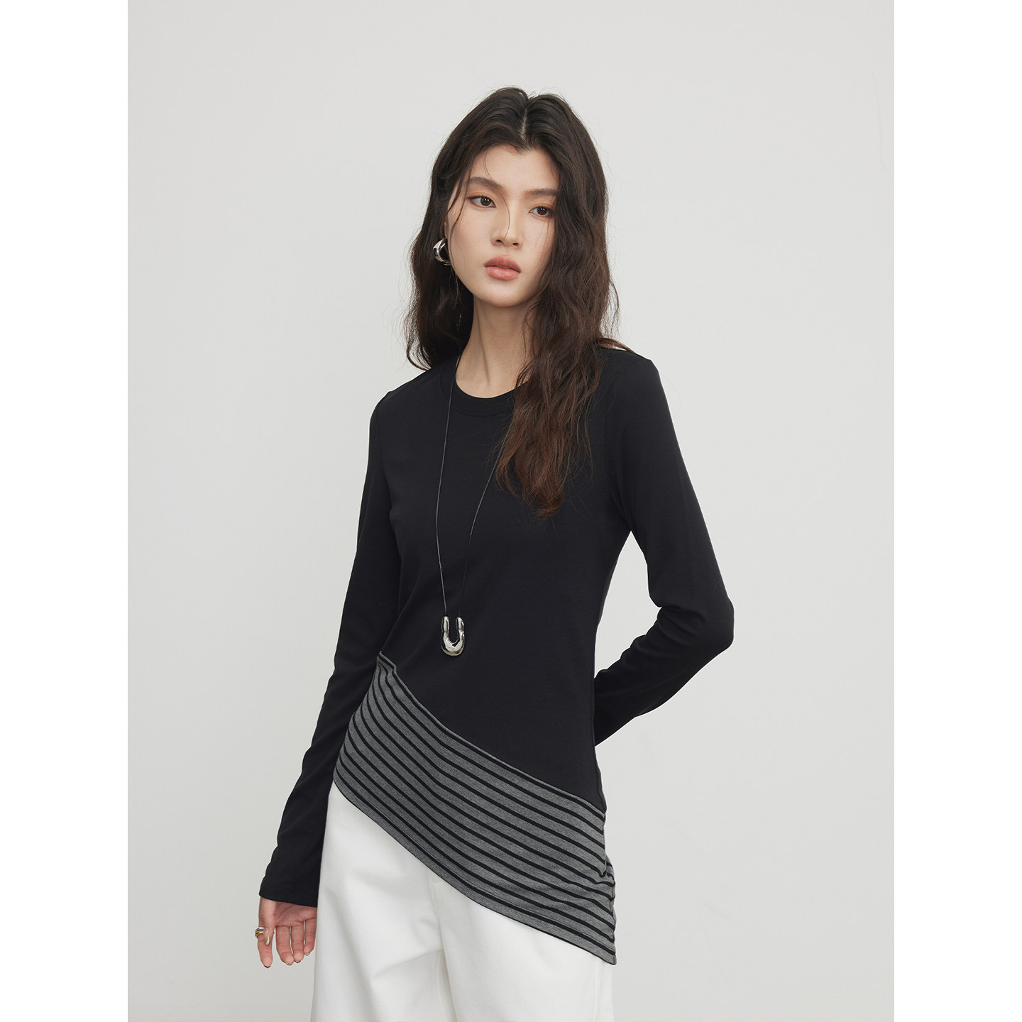 KEARA 小众设计感曜石黑针织拼接条纹针织衫女春通勤气质长袖上衣