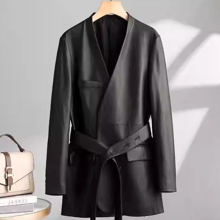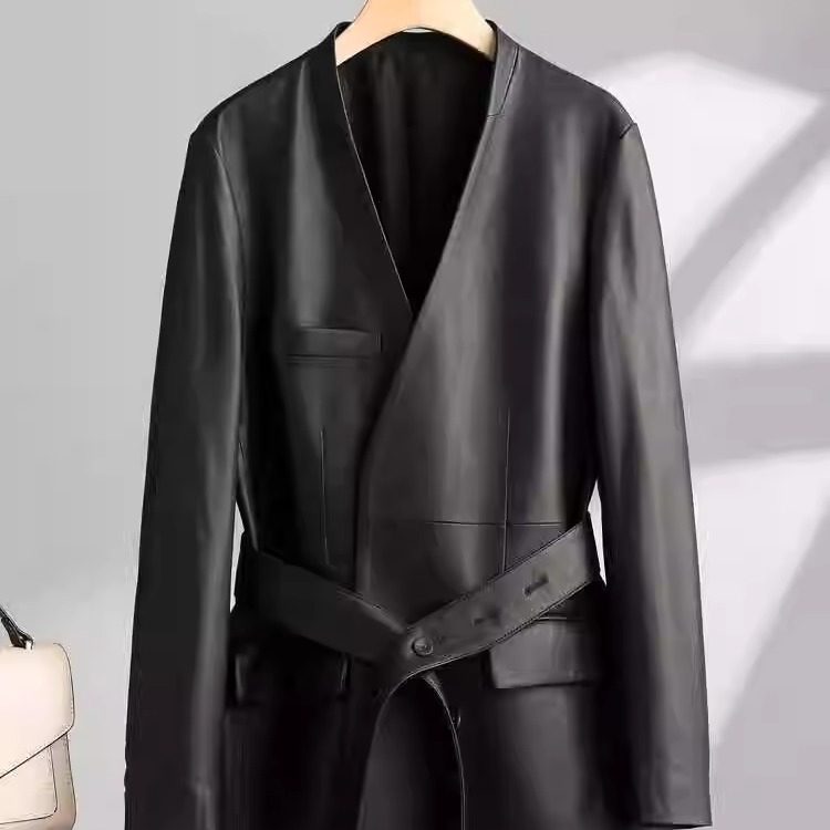 海宁皮衣女中长款收腰无领带腰带西装休闲夹克加棉百搭外套女
