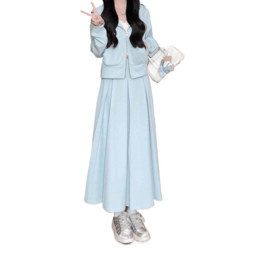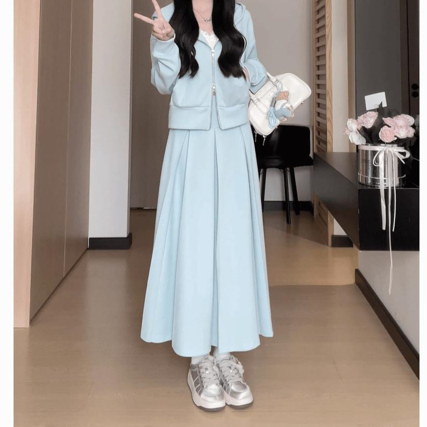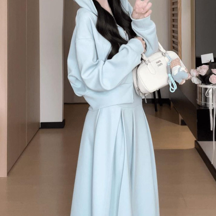 早秋搭配海盐蓝卫衣套装女2024新款浅色系开衫卫衣半身裙两件套潮