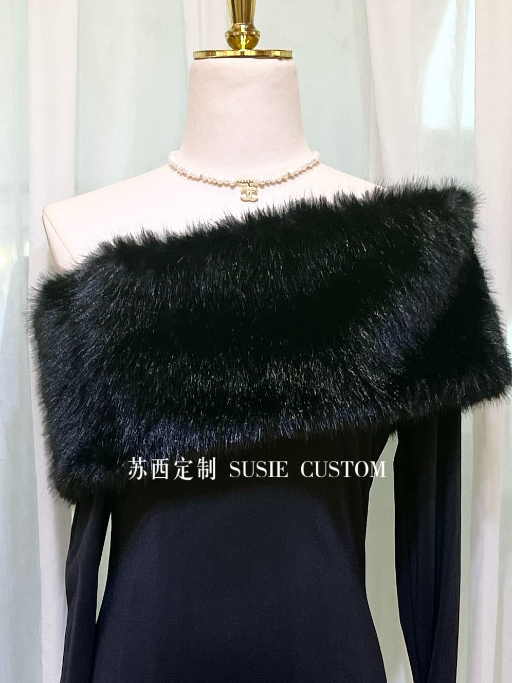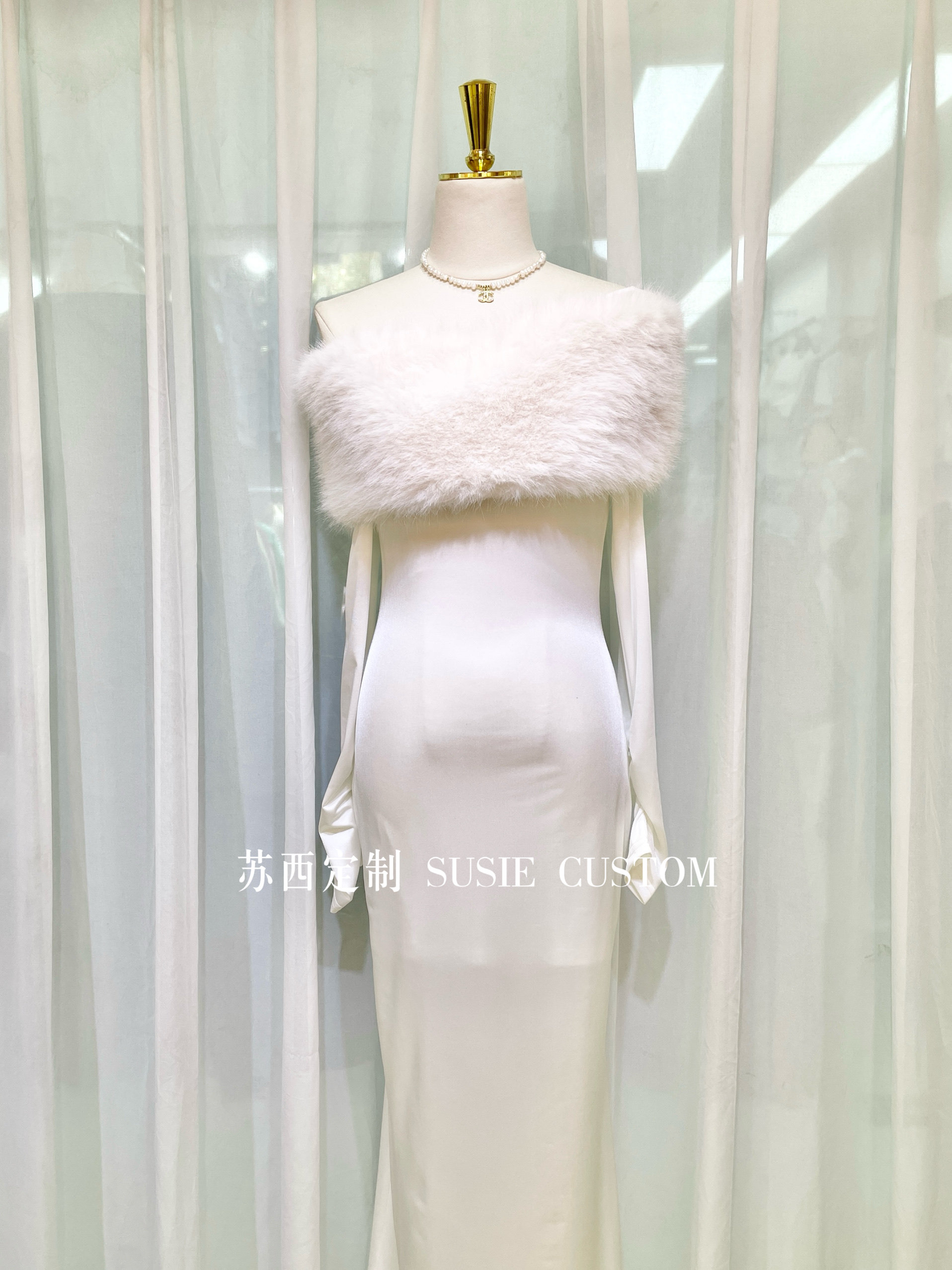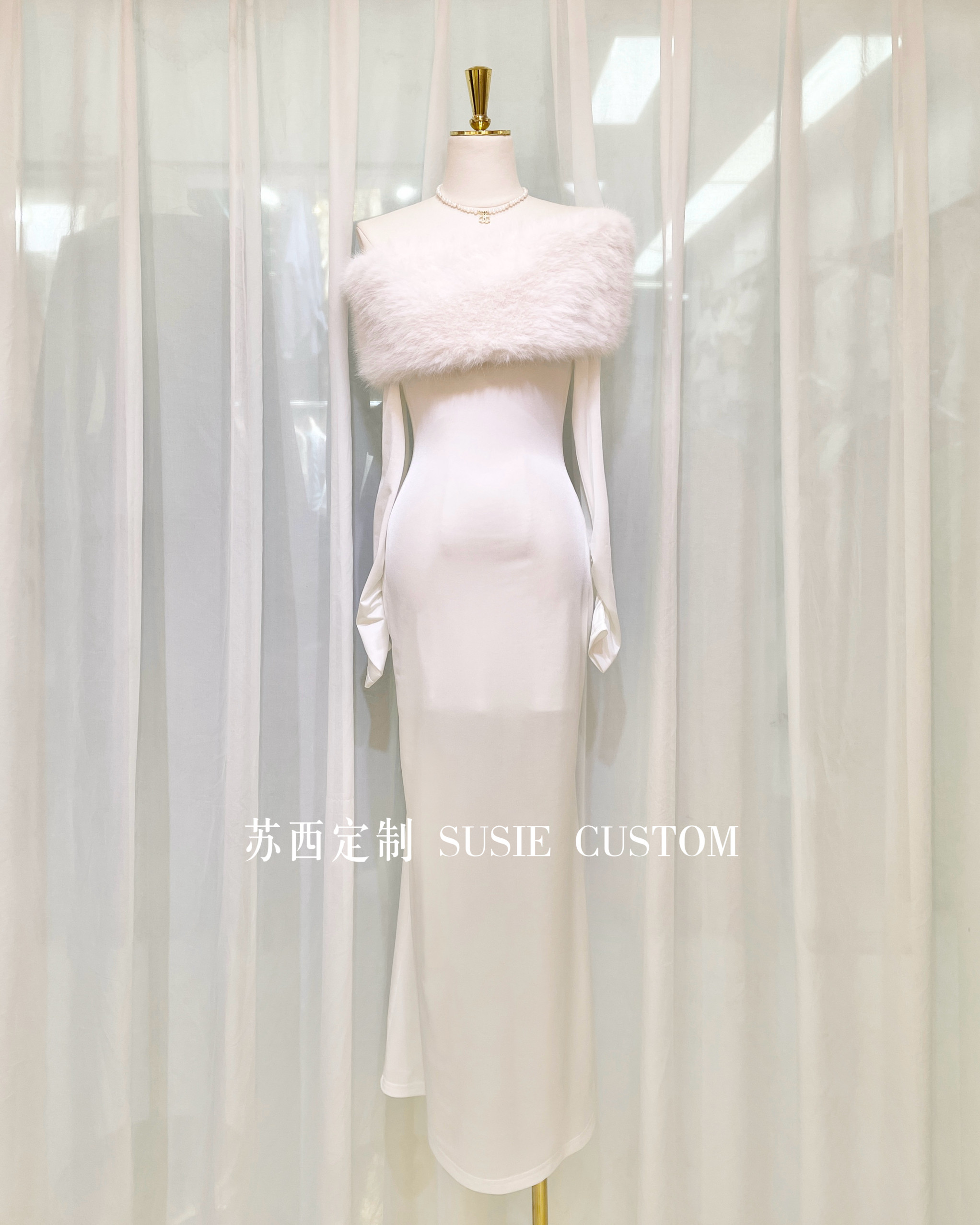 高定制设计款显身材一字肩露肩仿貂毛修身收腰包臀鱼尾长裙礼服裙