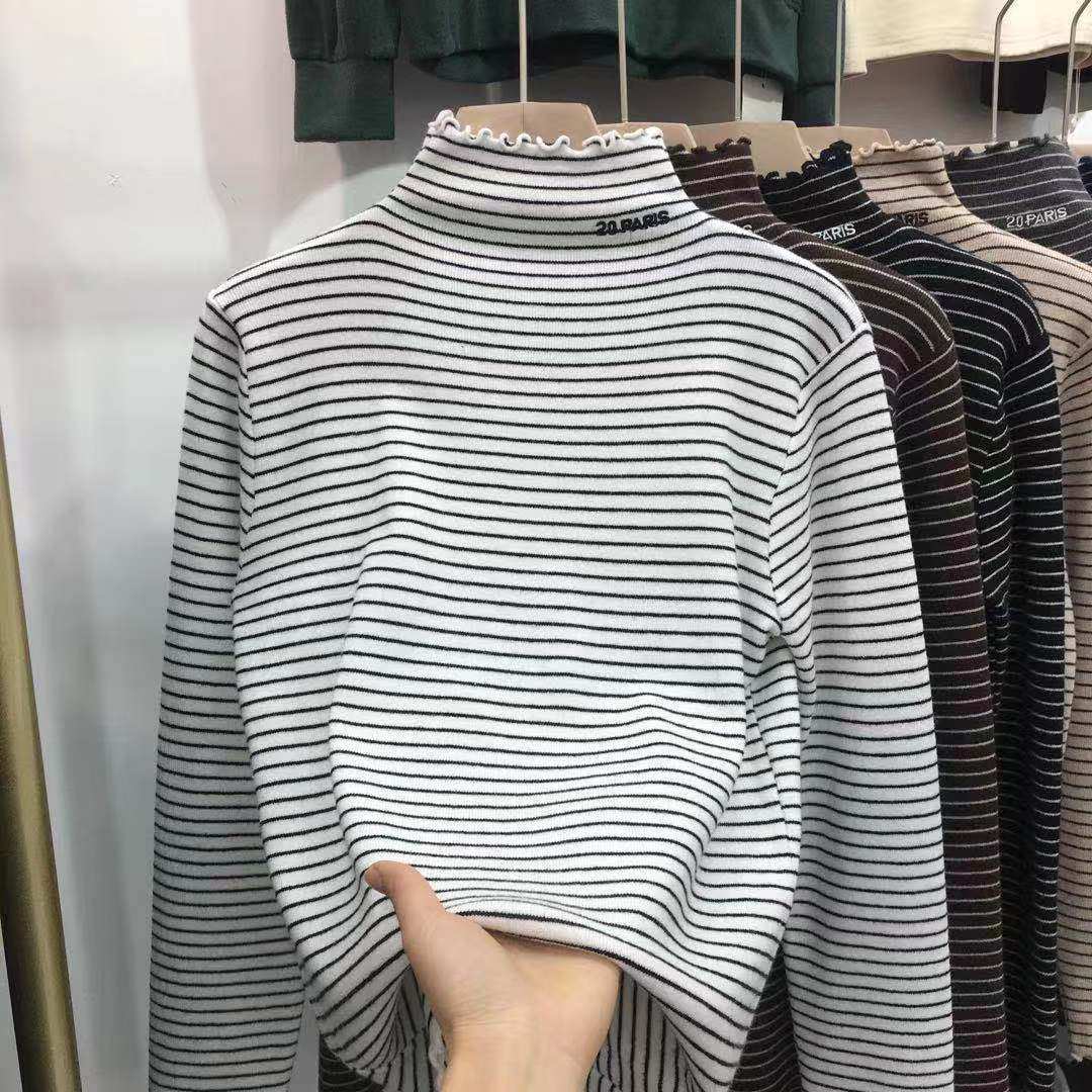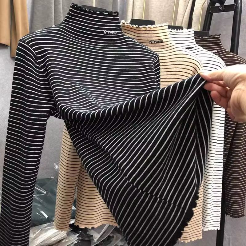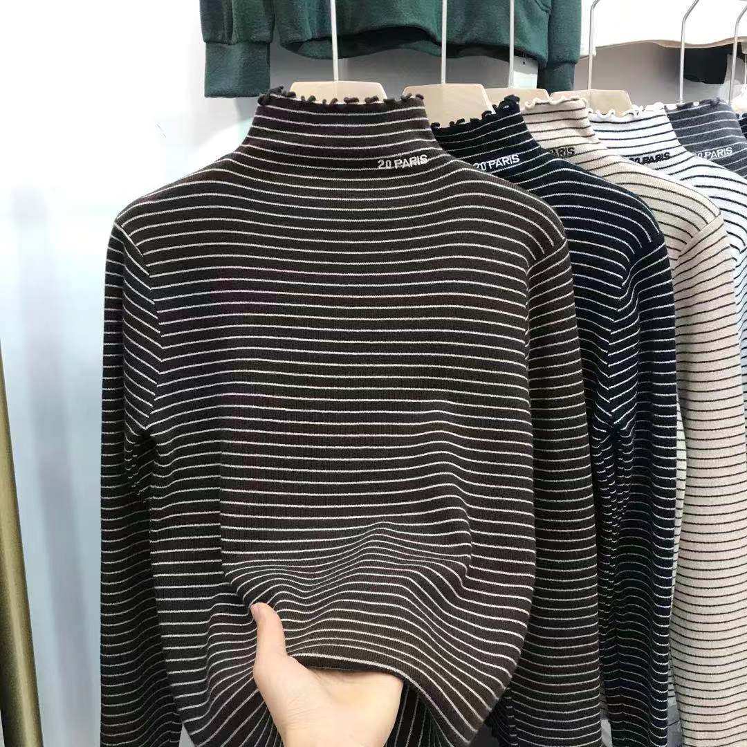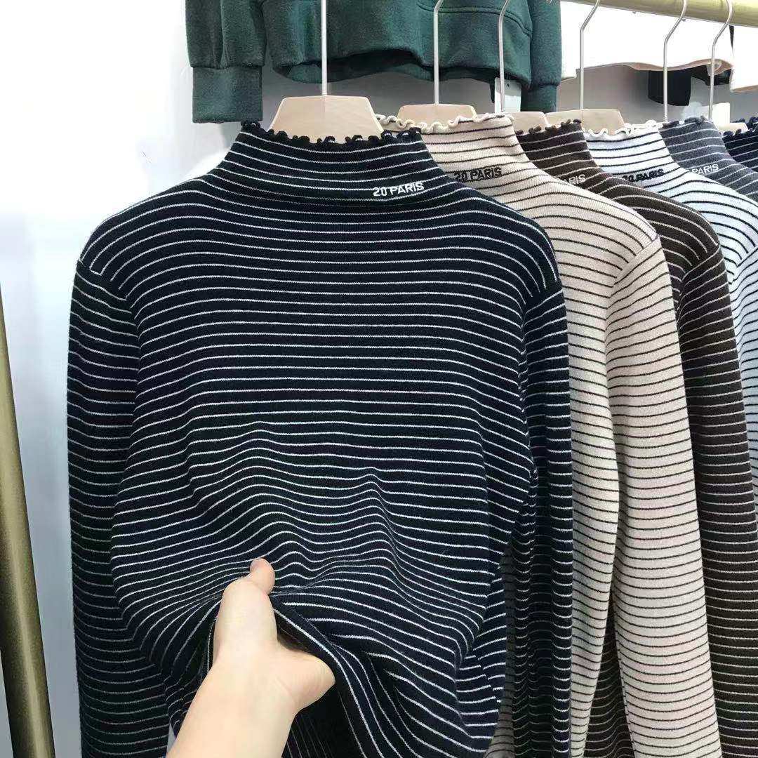 条纹半高领德绒打底衫女2025新款秋冬内搭木耳边加厚保暖长袖上衣