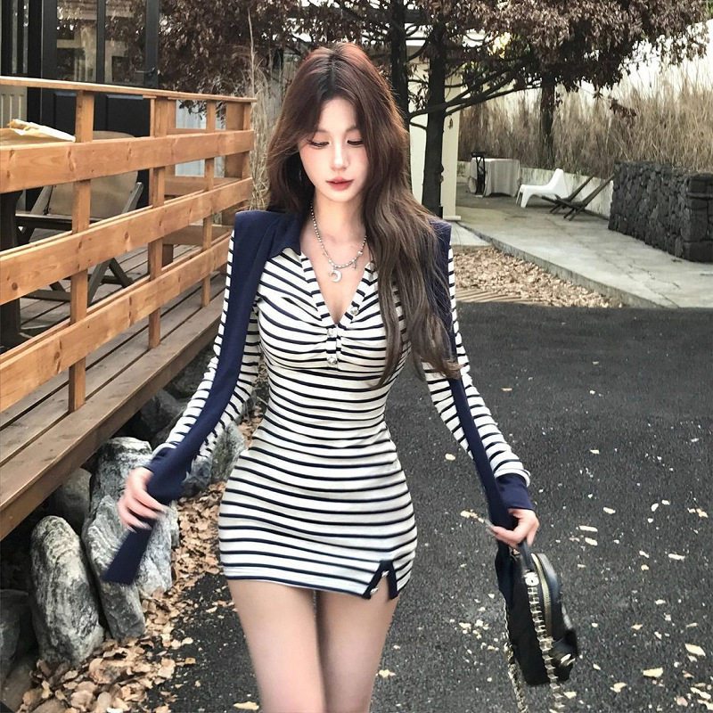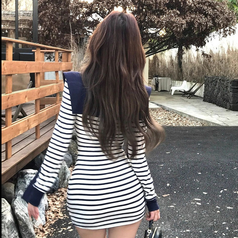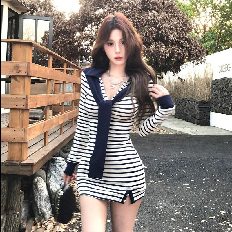 2025新款潮流条纹设计披肩纯欲连衣裙女装秋季名媛气质长袖包臀裙