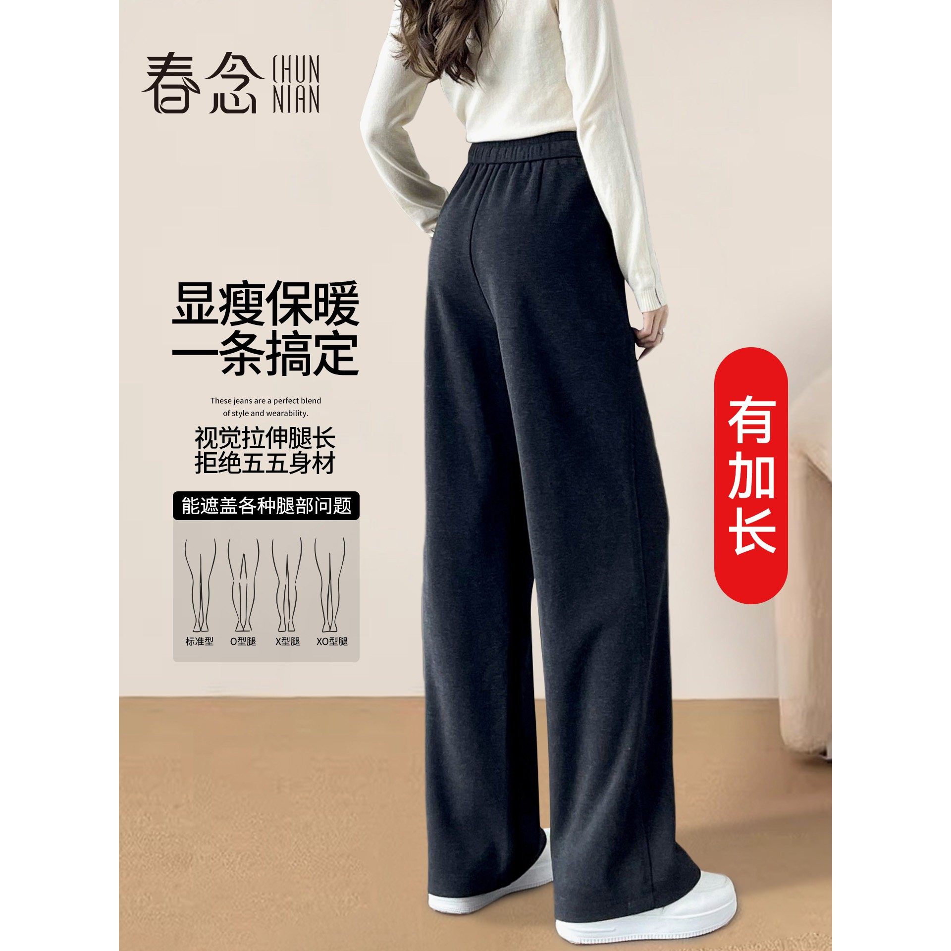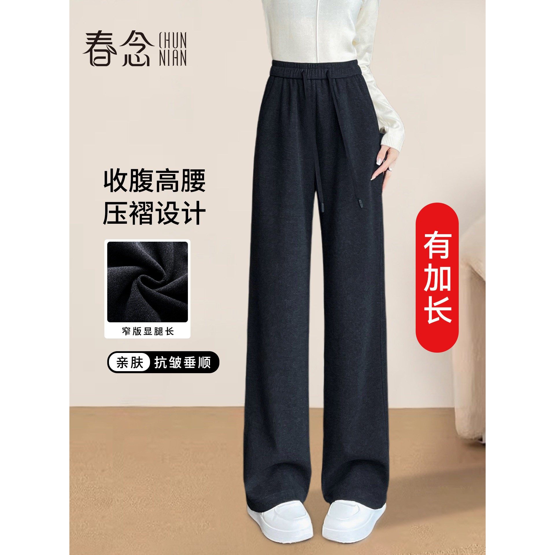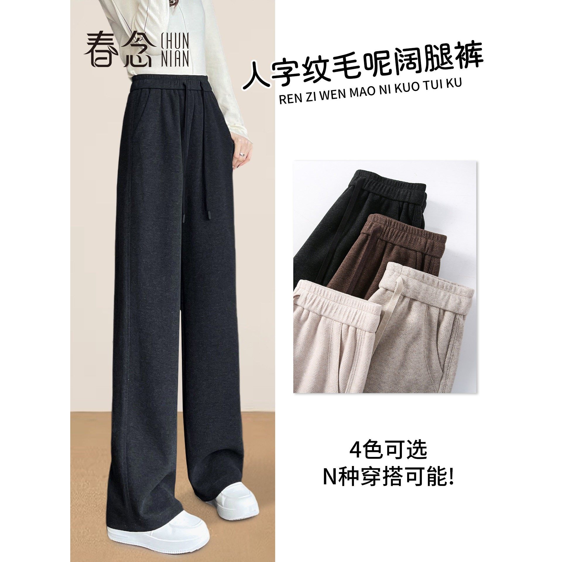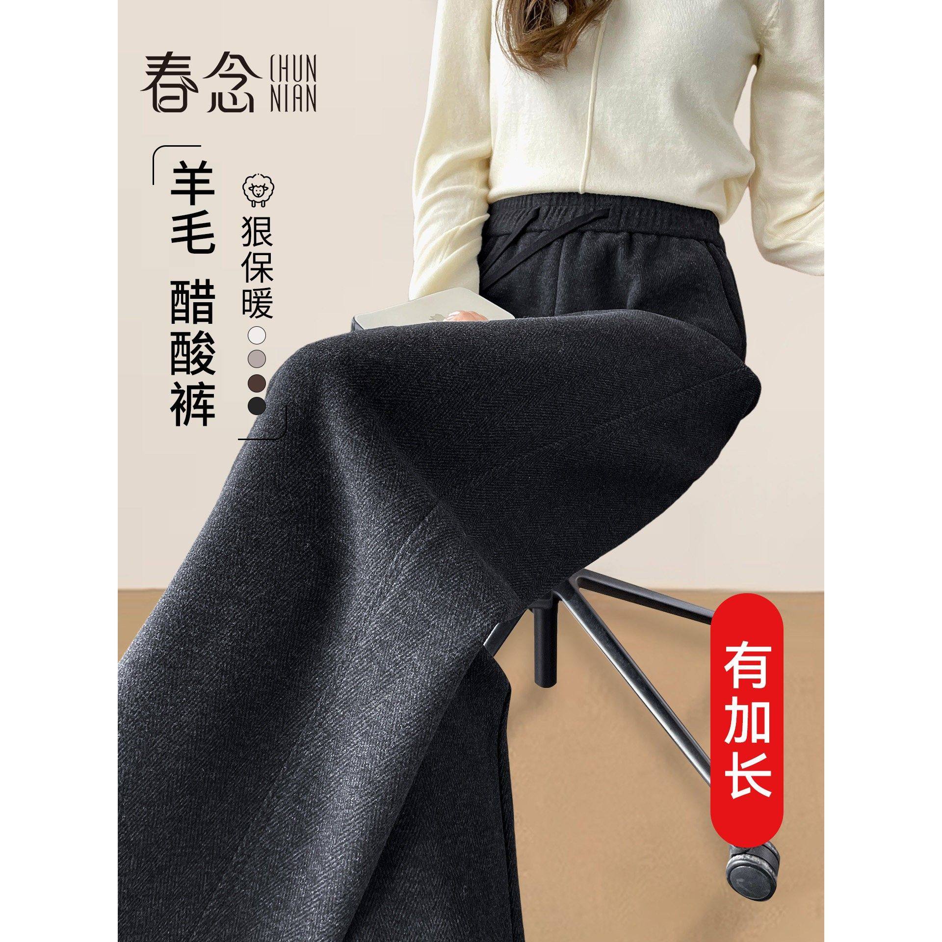 黑灰色人字纹毛呢阔腿裤女秋冬2025新款加长裤子醋酸羊毛直筒加绒