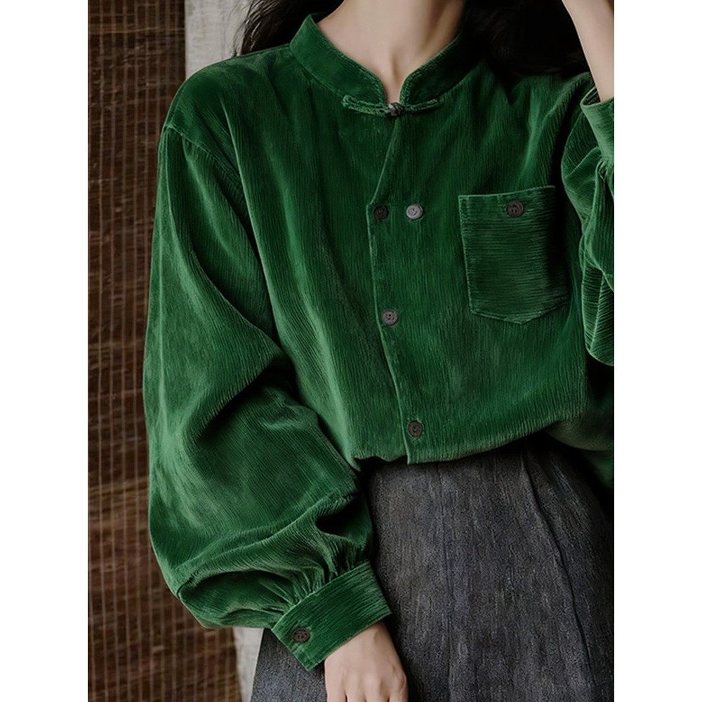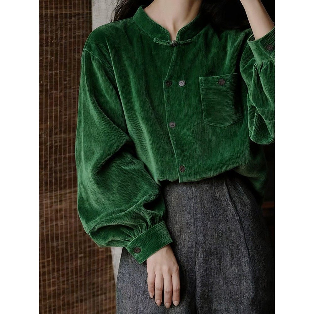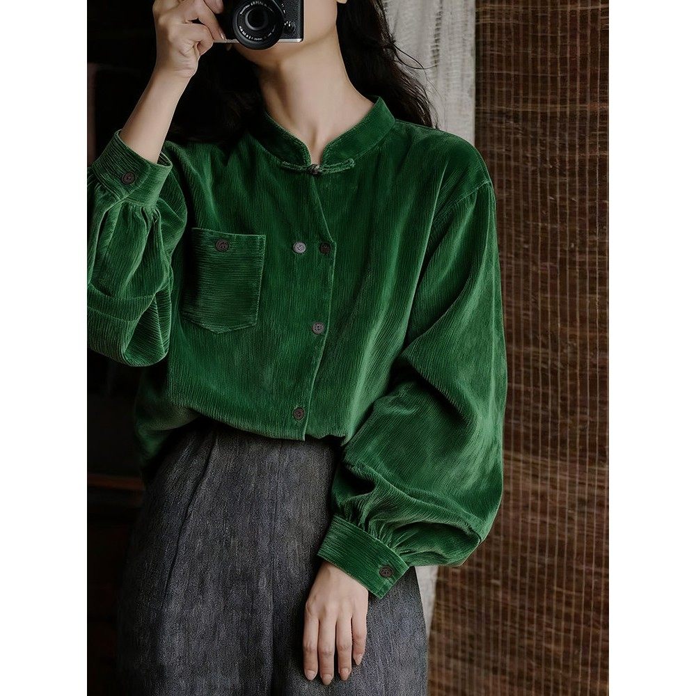 覆古绿灯芯绒立领盘扣灯笼袖衬衫2025秋季新款新中式国风禅意上衣