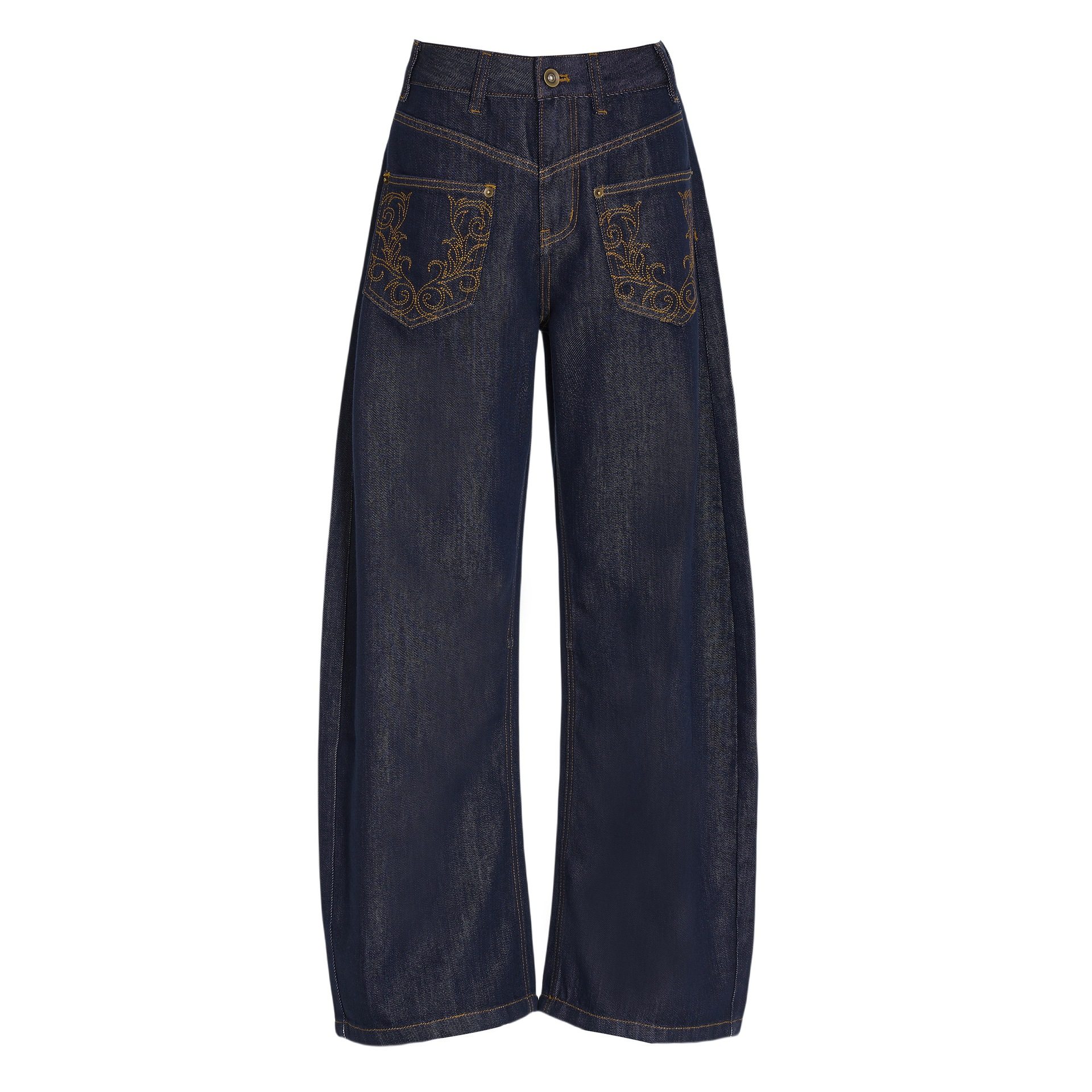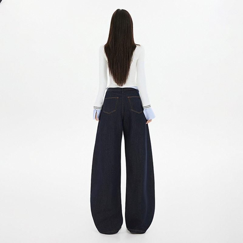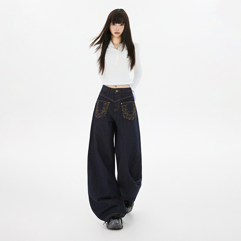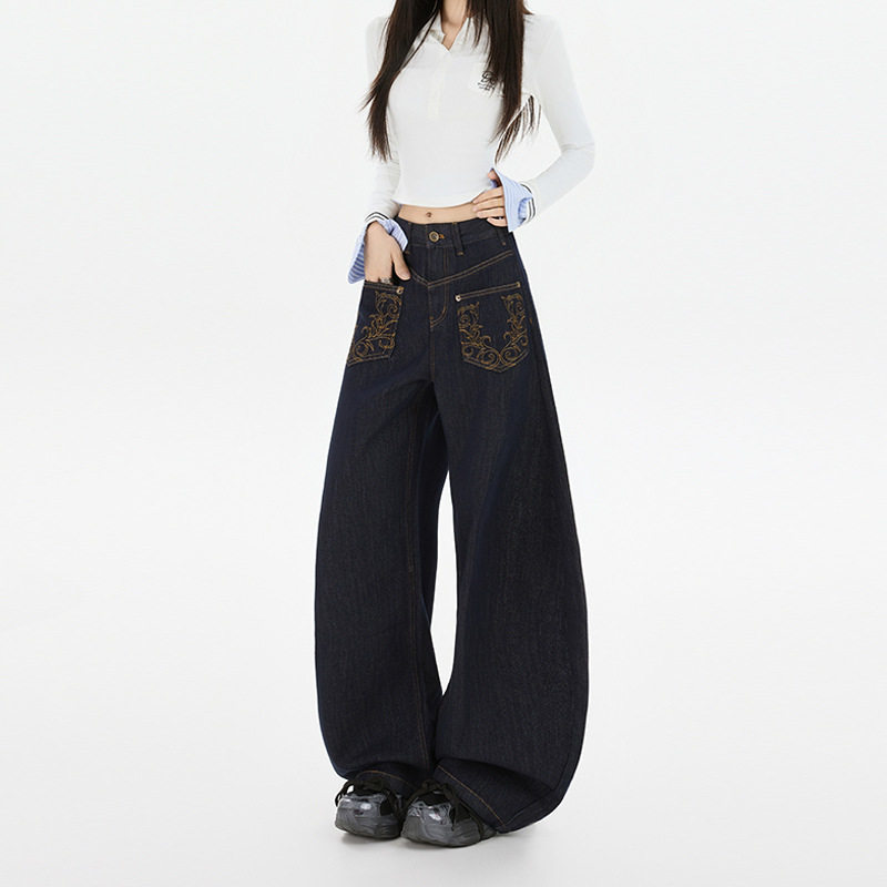 美式复古小众深蓝刺绣阔腿牛仔裤2025女秋冬新款显瘦高腰弯刀裤