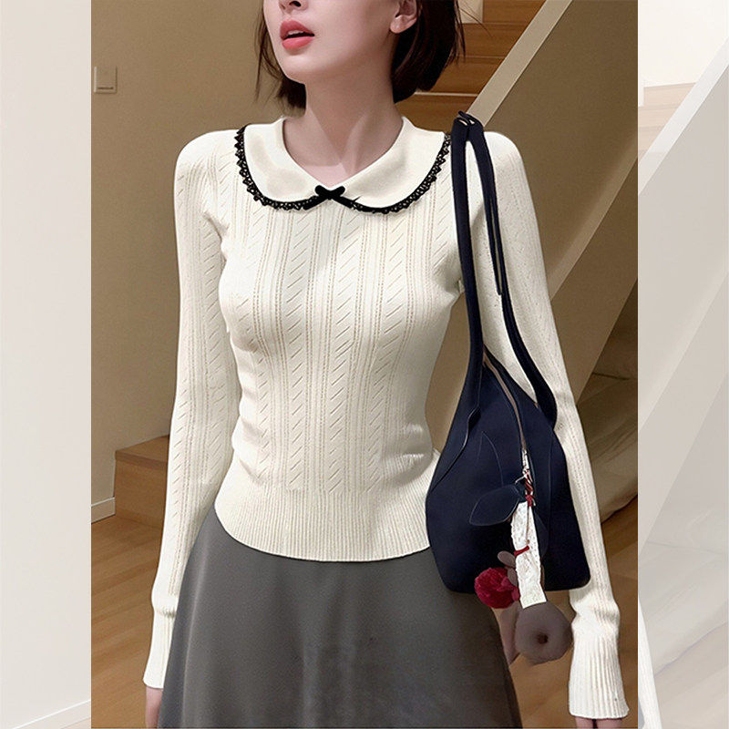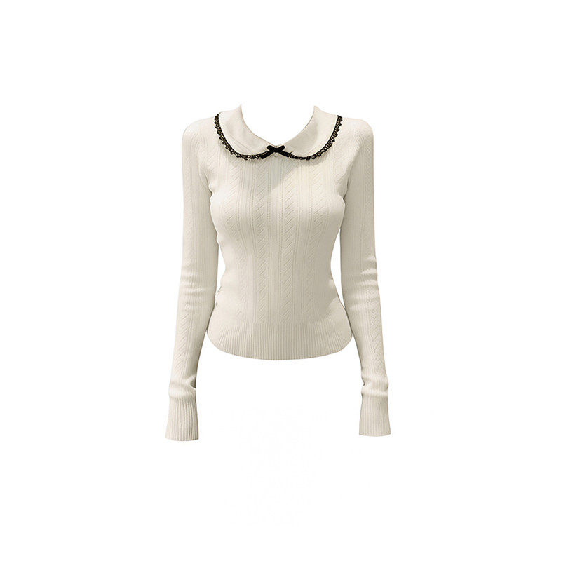 法式白色娃娃领翻领长袖针织衫女秋冬毛衣打底衫内搭软糯加厚上衣