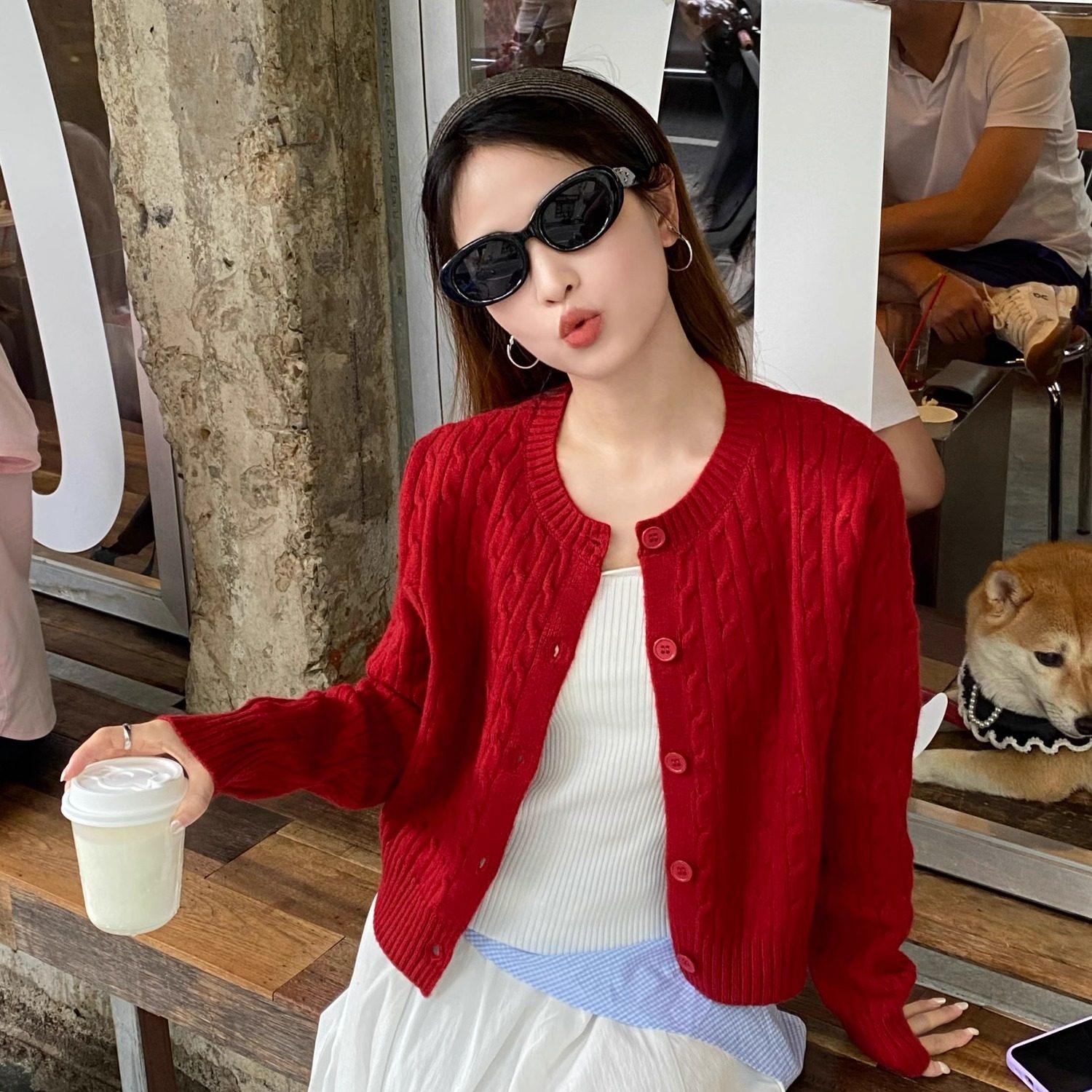 韩系氛围感短款麻花毛衣外套女巨好看的圣诞穿搭红色针织开衫上衣