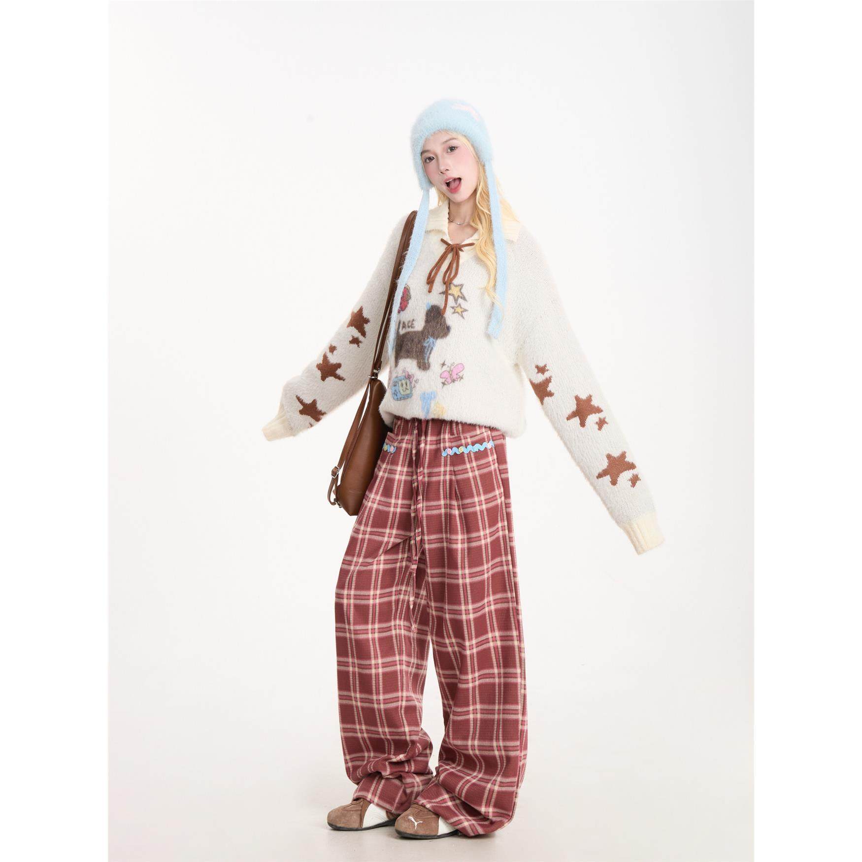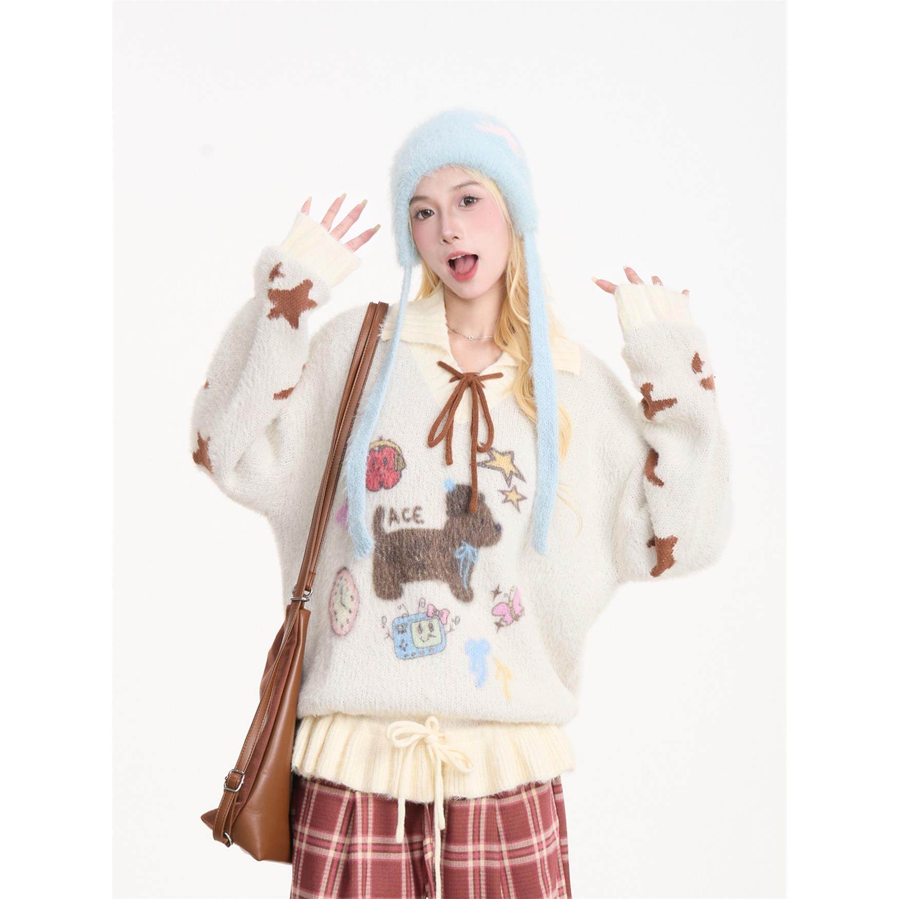 NERESUM卡通小狗提花套头毛衣女可爱减龄慵懒系带宽松针织上衣