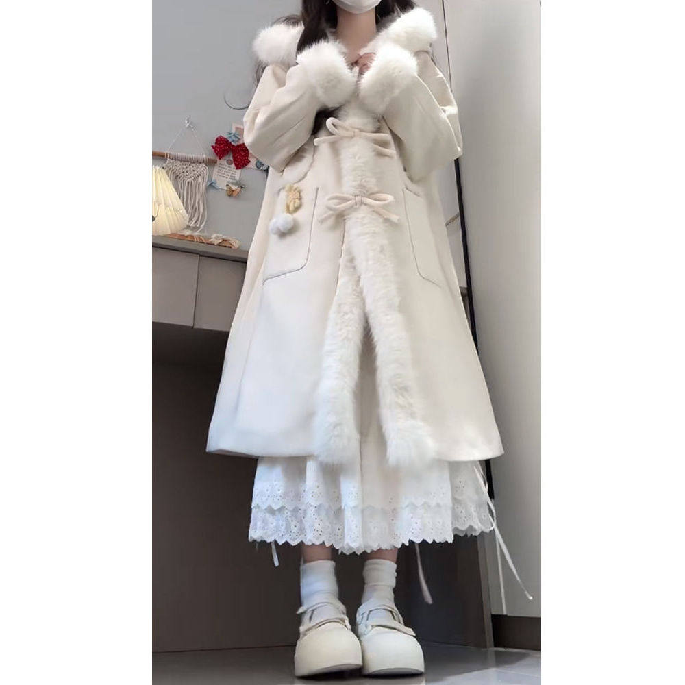 天山暮雪 冬装新款甜美气质连帽毛领设计蝴蝶结扣学院风毛呢大衣