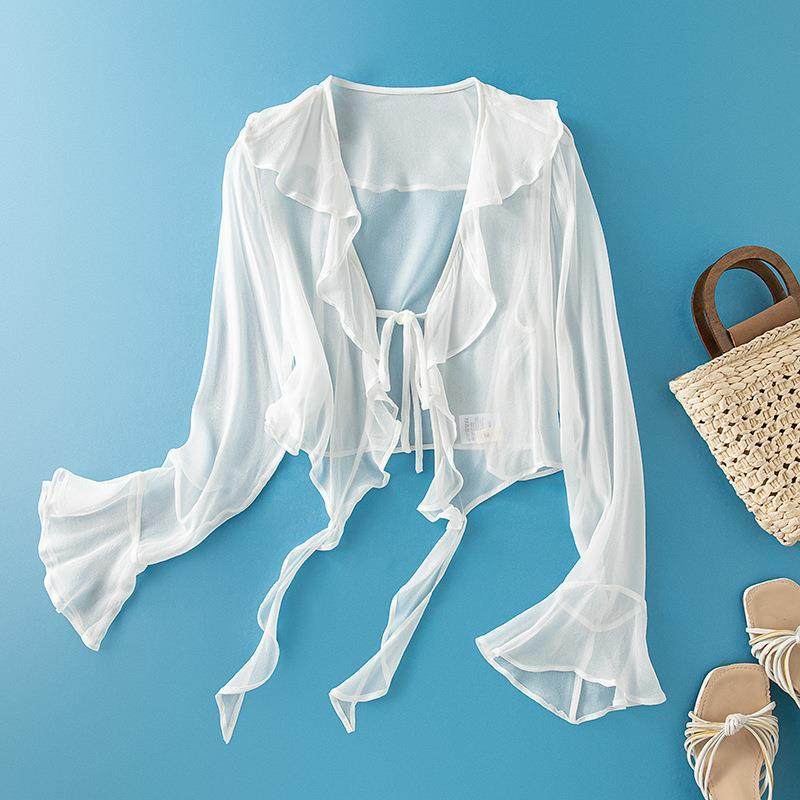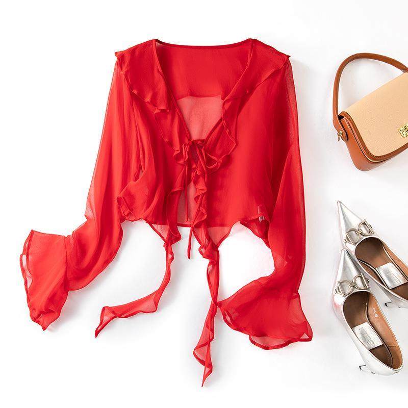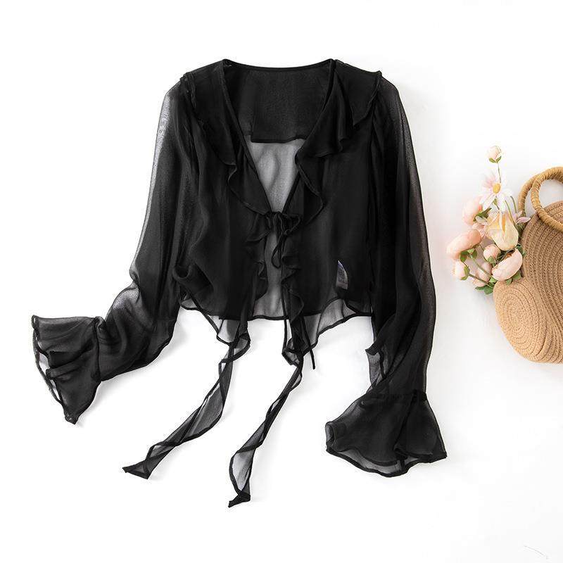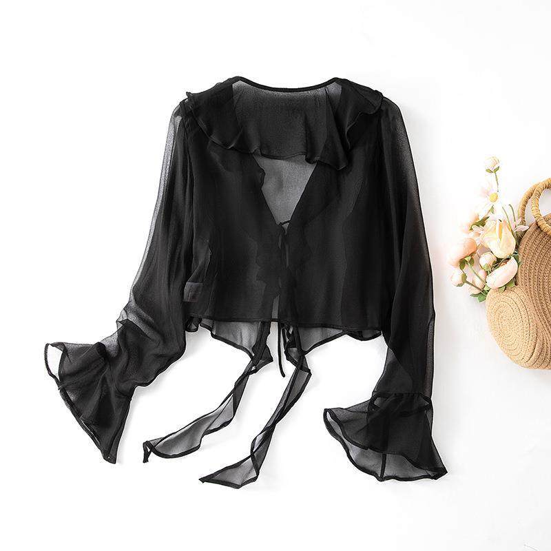 新夏季时尚气质通勤真丝桑蚕丝长袖拼接衬衫女披肩外套开衫85042