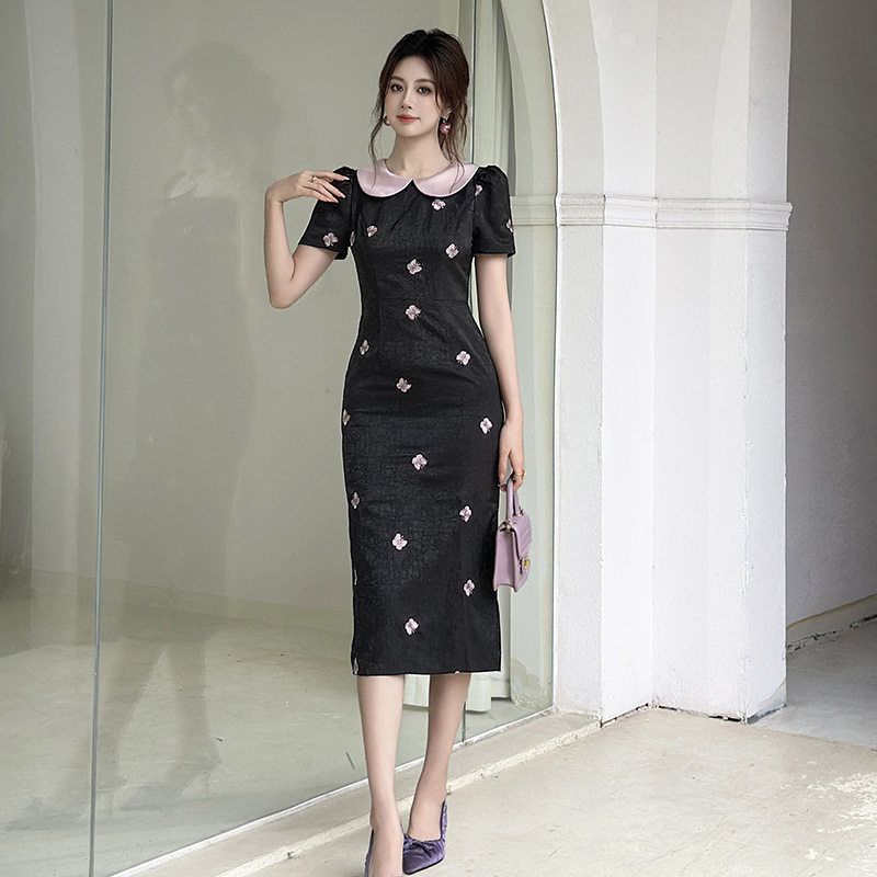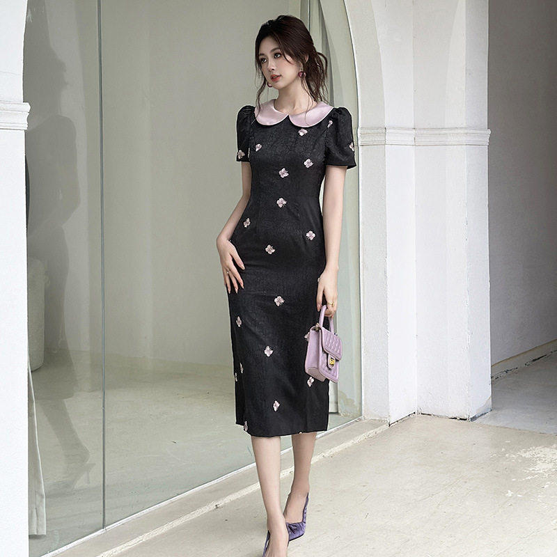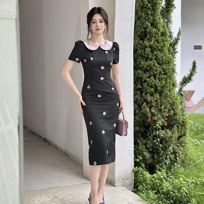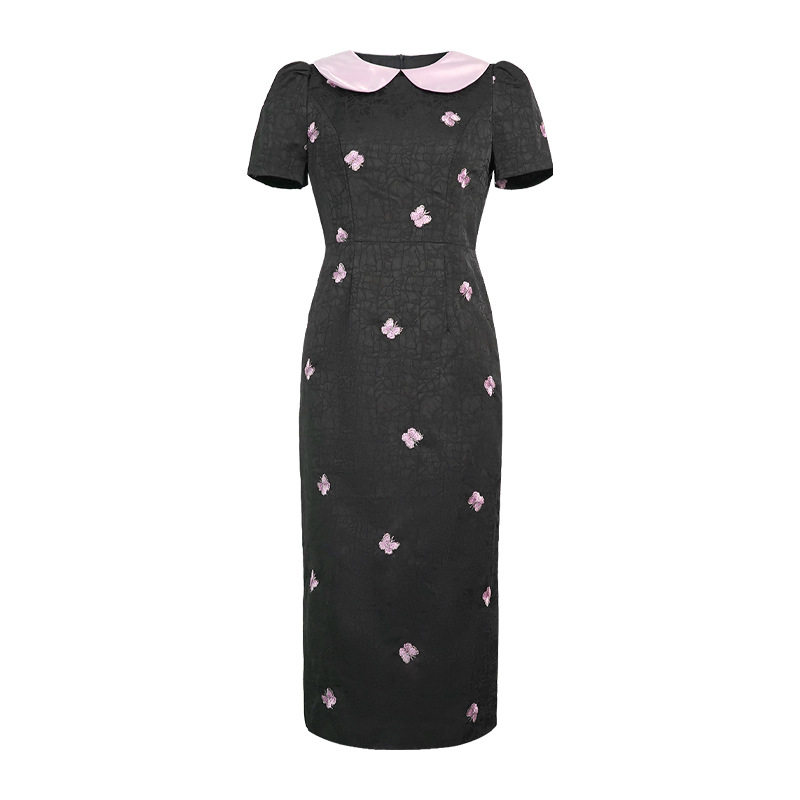 2025夏季新款女法式复古娃娃脸减龄气质修身包臀刺绣连衣裙15507