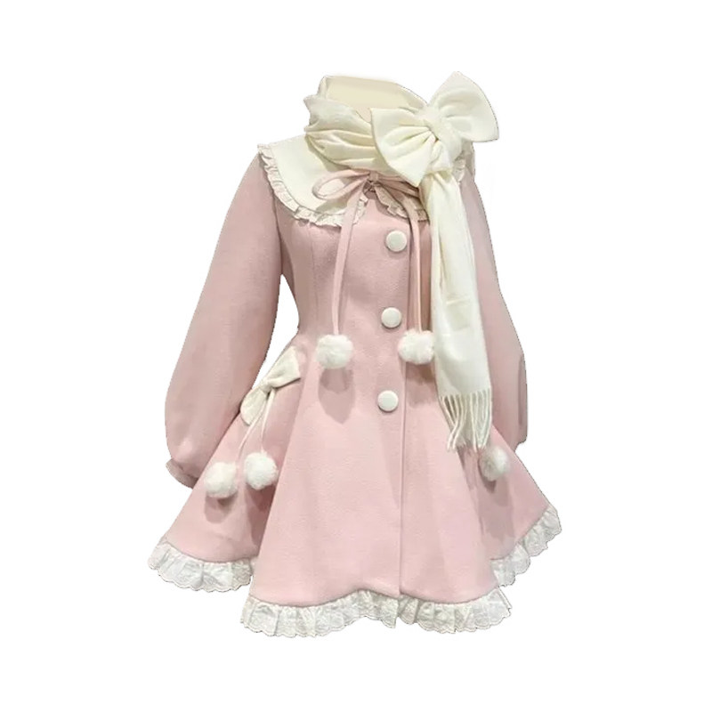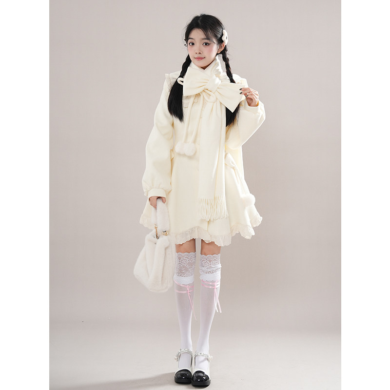 秋冬甜美风小个子围巾花边娃娃领毛球系带毛呢外套2025秋冬新款女
