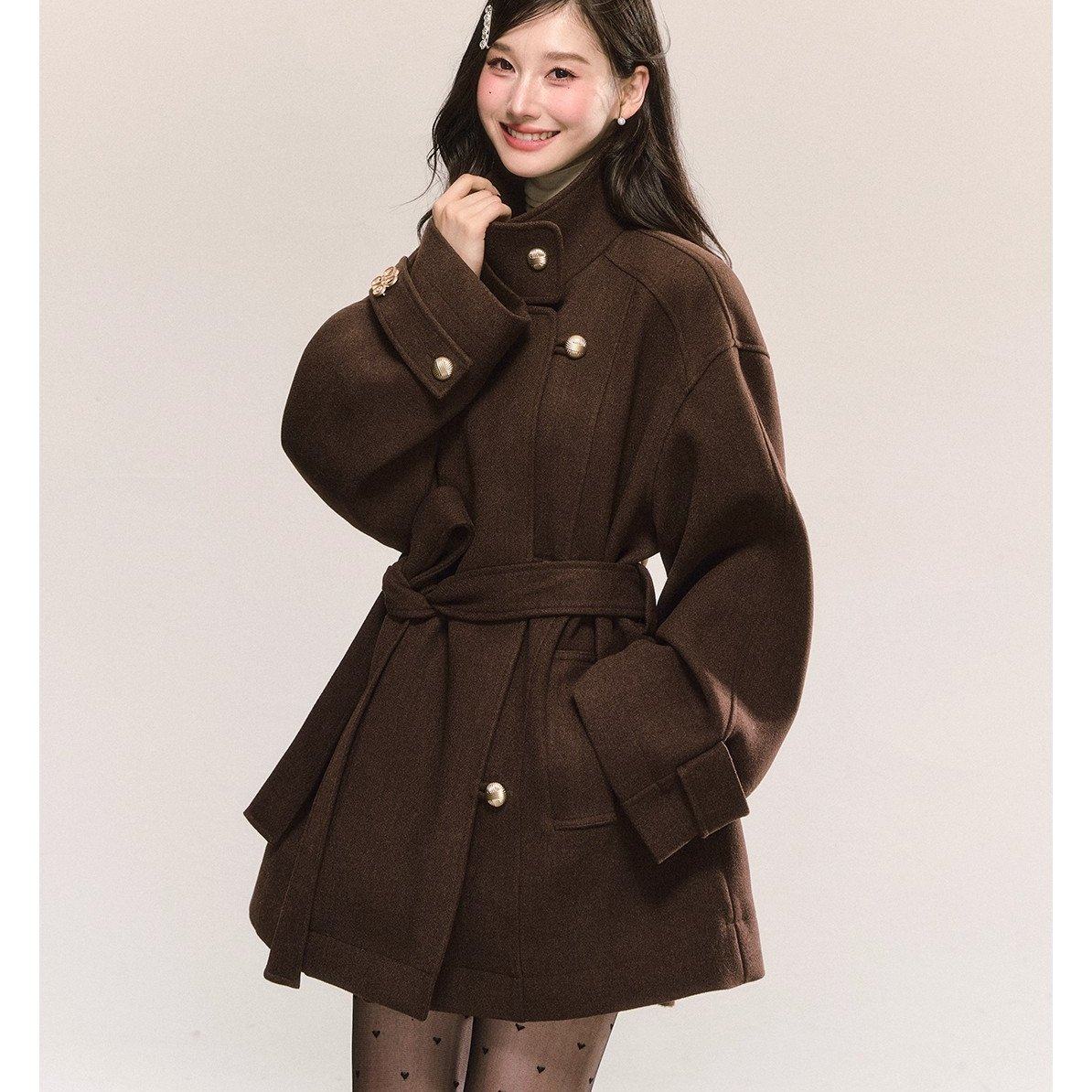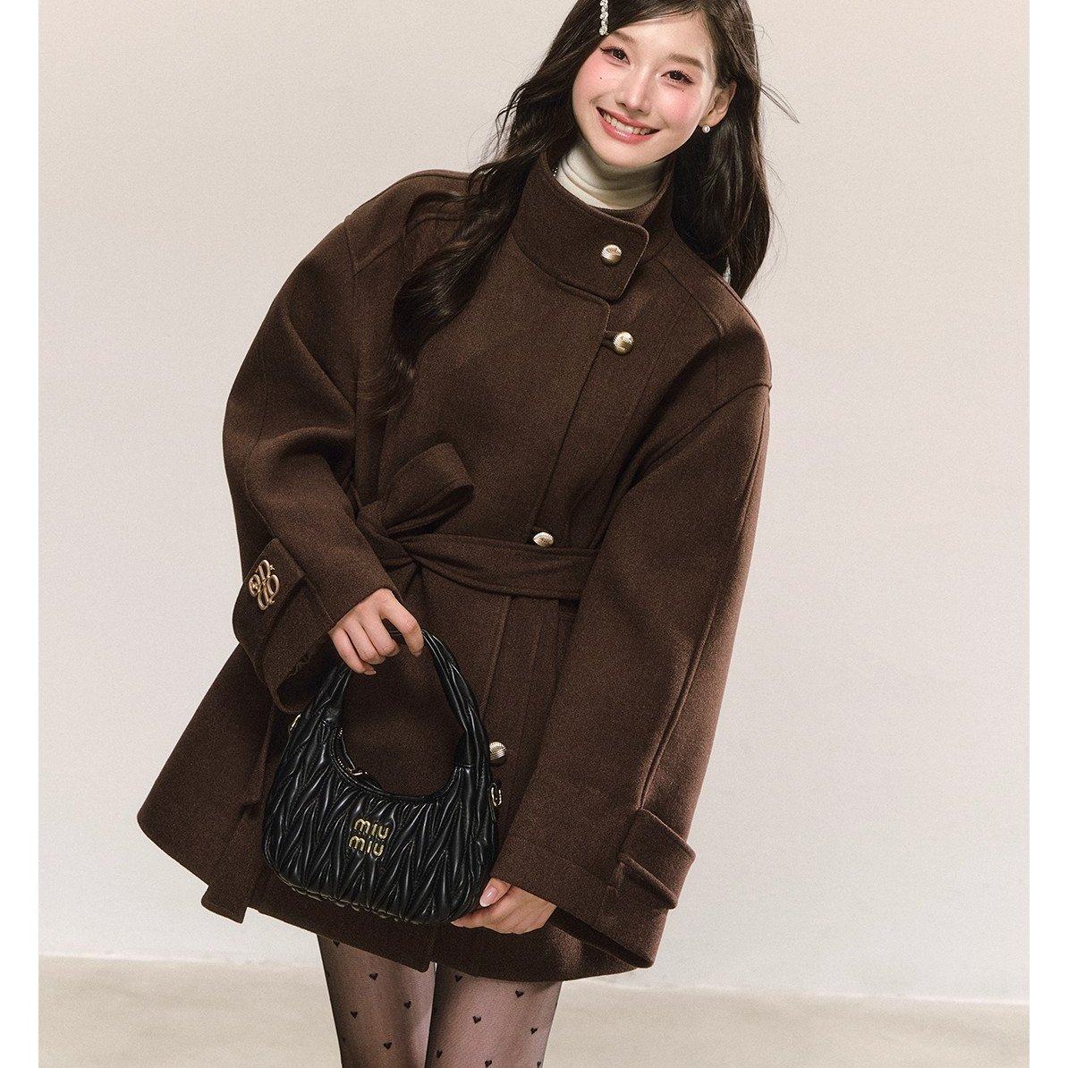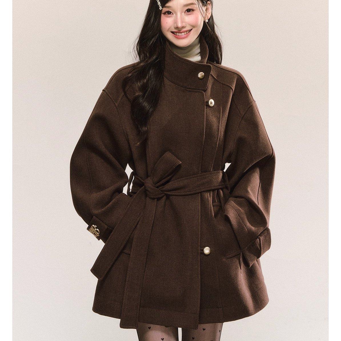 有配饰#复古高级感立领毛呢外套2025冬新款系带收腰显瘦气质大衣