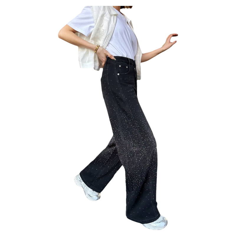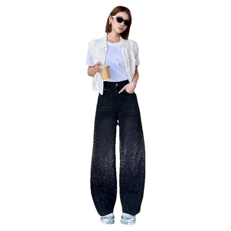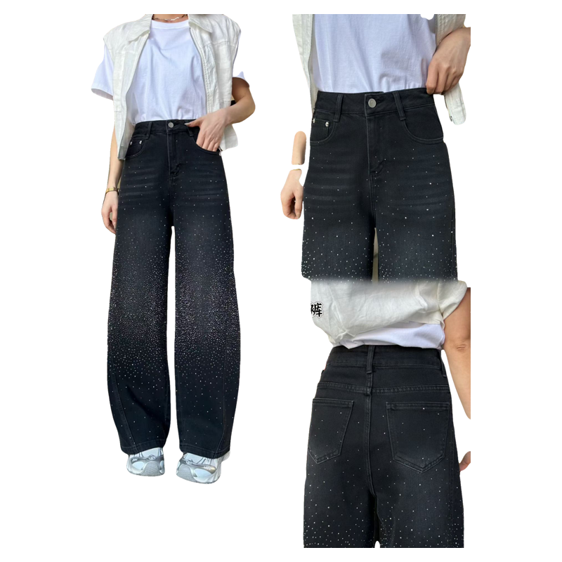 2026新款高腰显瘦直筒牛仔裤女宽松阔腿拖地弯刀粘钻长裤子