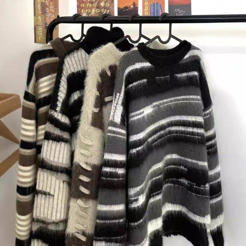 软糯仿水貂绒条纹撞色毛衣女秋冬宽松设计感小众慵懒风针织衫上衣