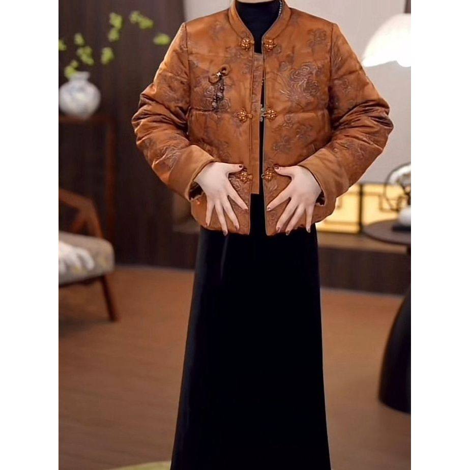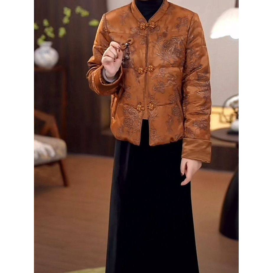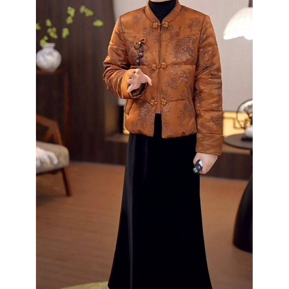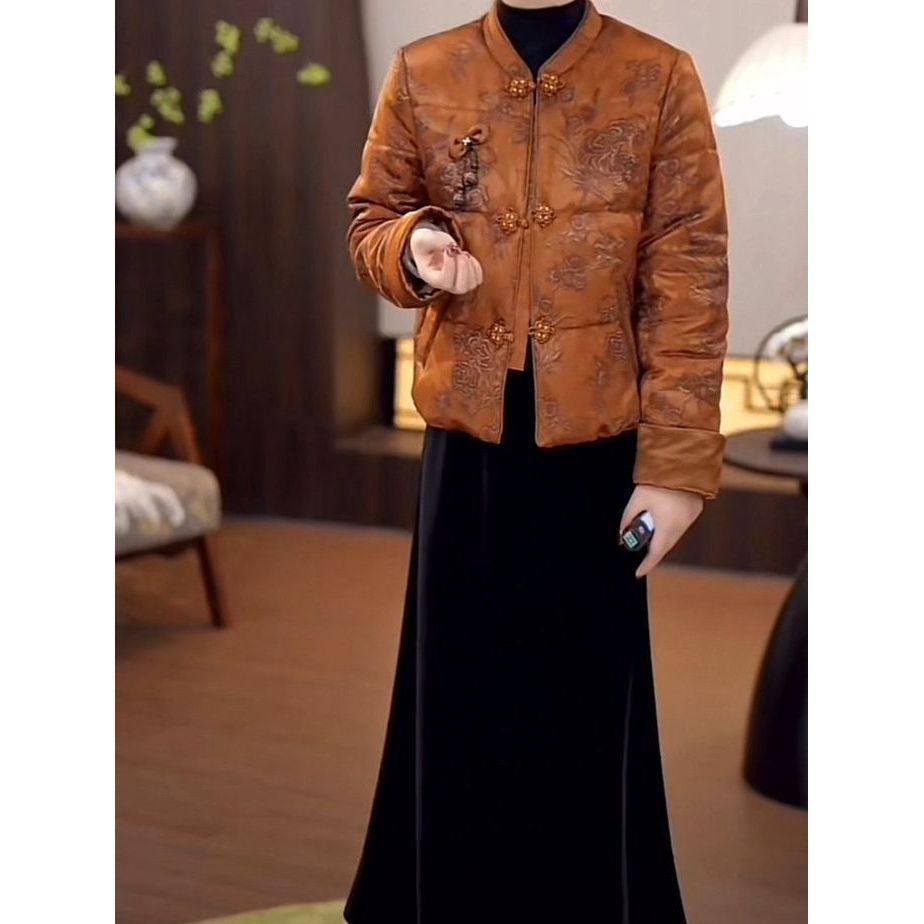 夹棉加厚新中式丝缎两件套2025冬新款时尚气质显瘦外套半身裙套装