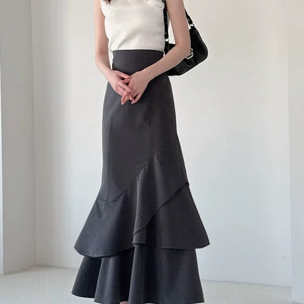 D070104日单新款GL隐形拉链松紧高腰鱼尾裙女甜美气质层次半身裙