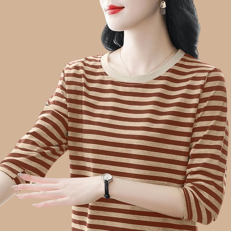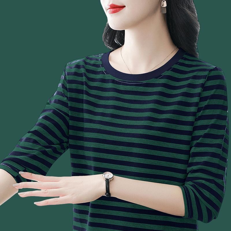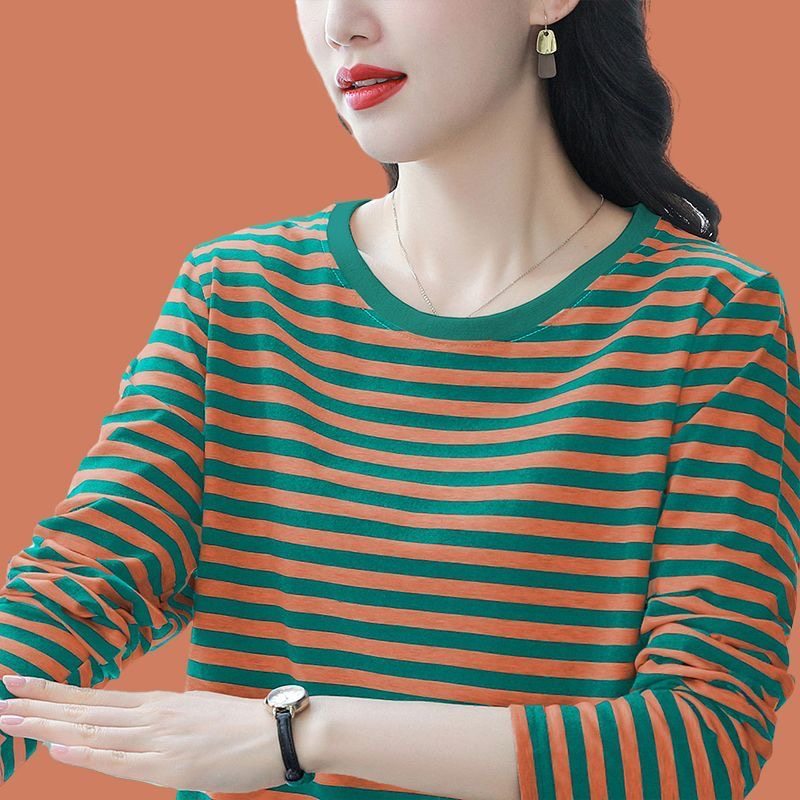 纯棉条纹长袖T恤女士打底衫春秋装新款大码宽松显瘦百搭洋气上衣