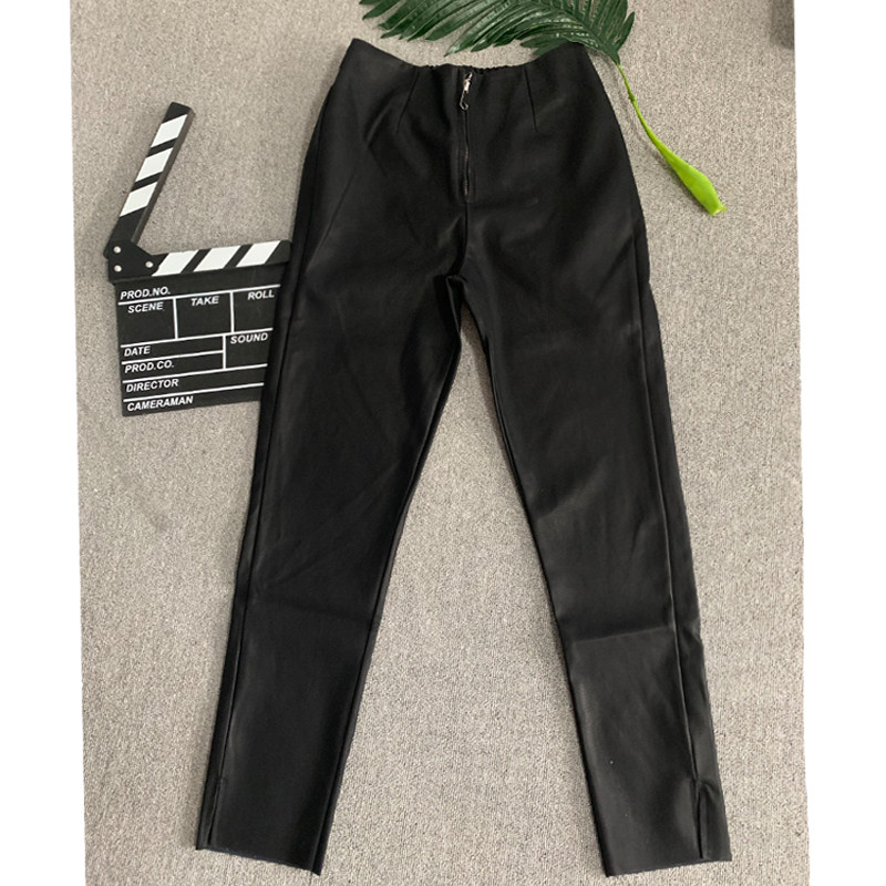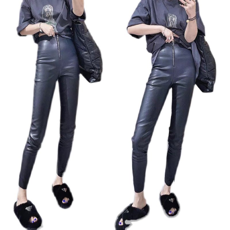 欧货春秋新款pu皮前拉链仿皮打底裤弹力修身一体腰小脚九分铅笔裤