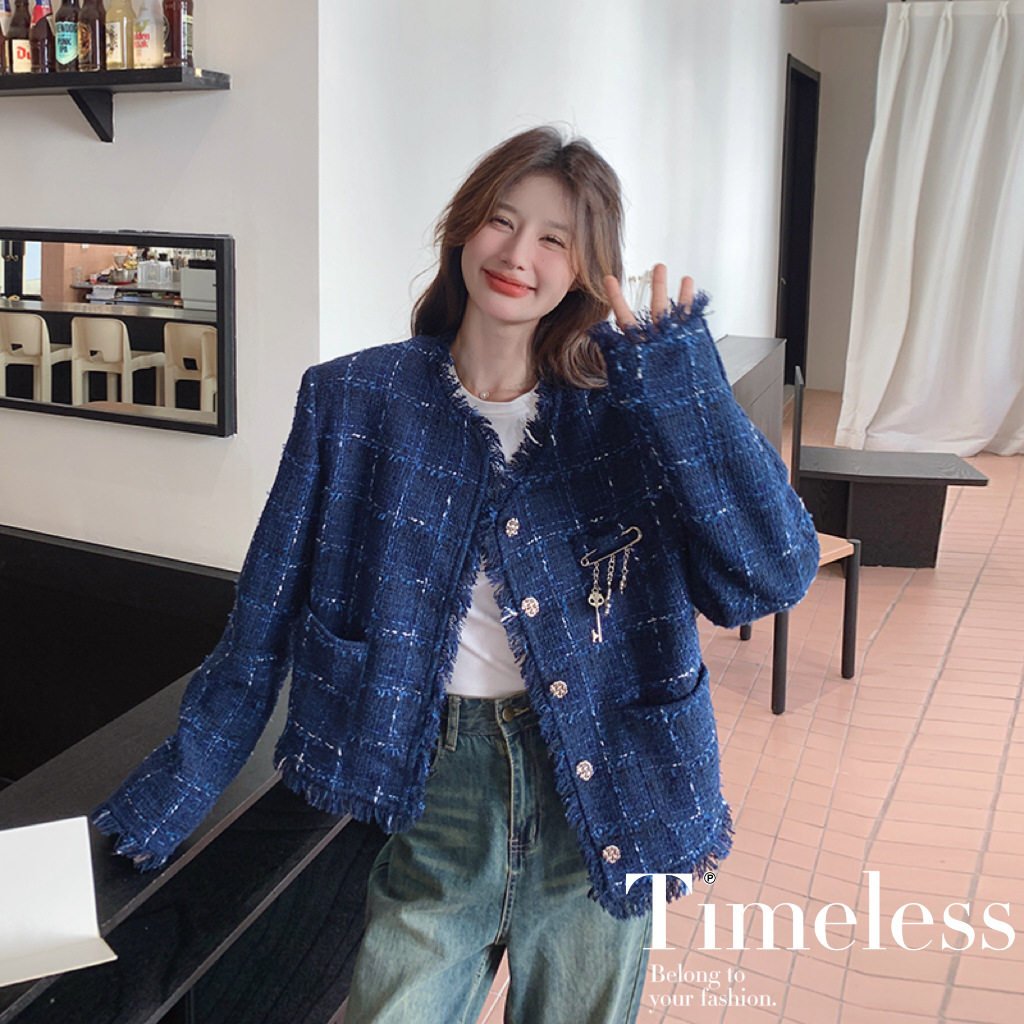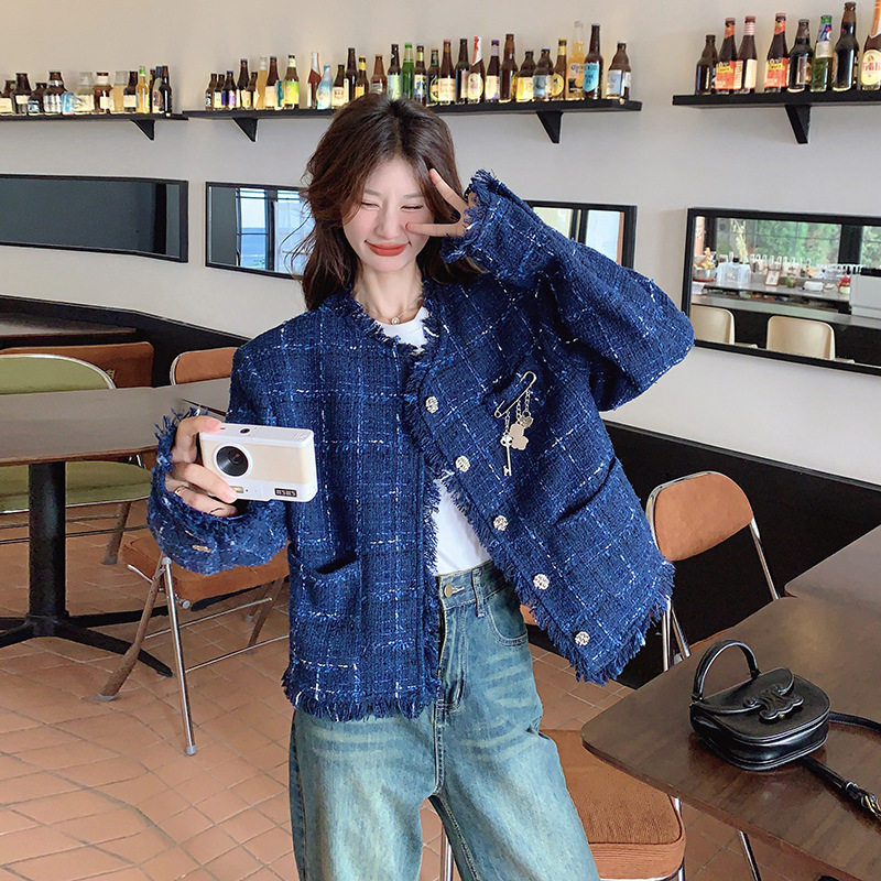 法式名媛蓝色小香风外套女秋冬短款2024新款韩系千金开衫上衣