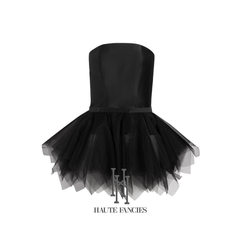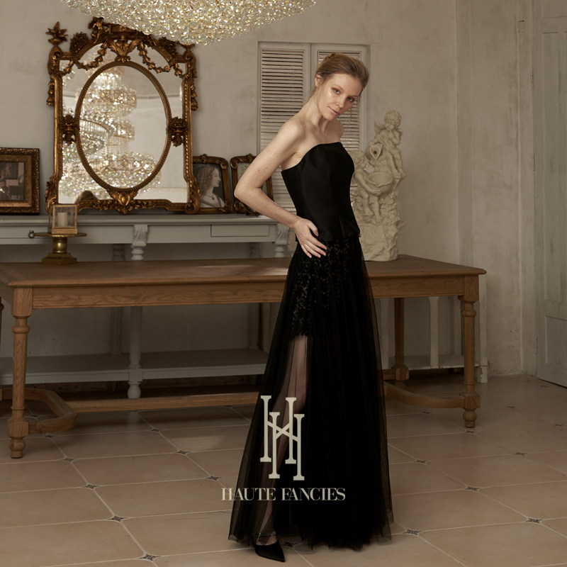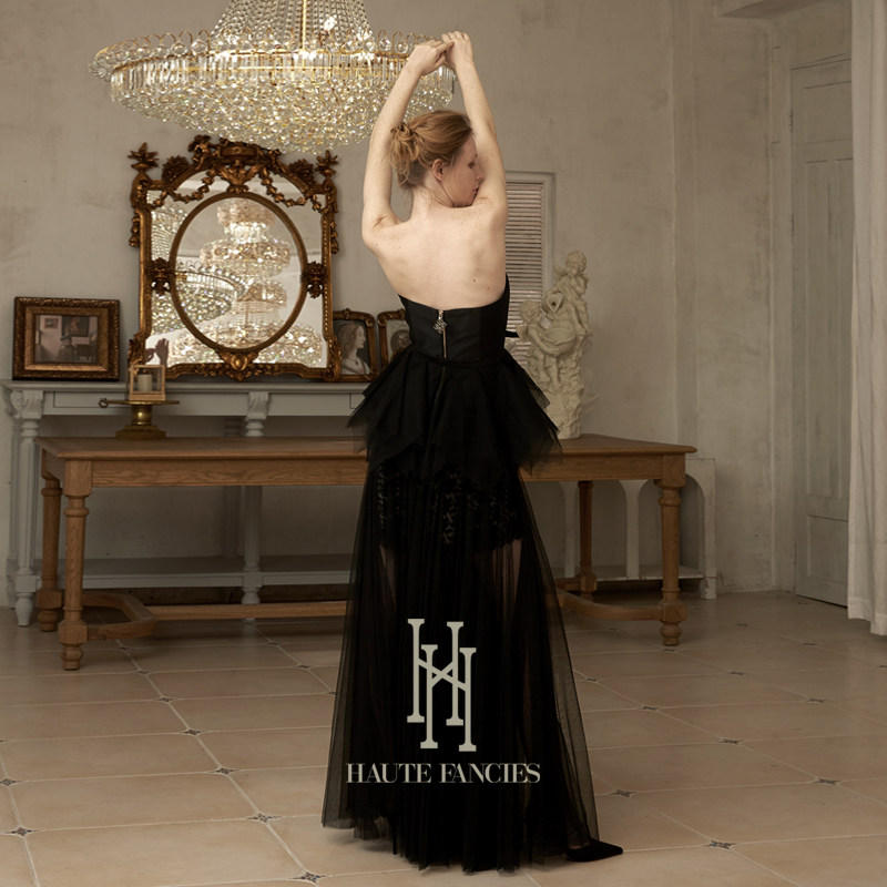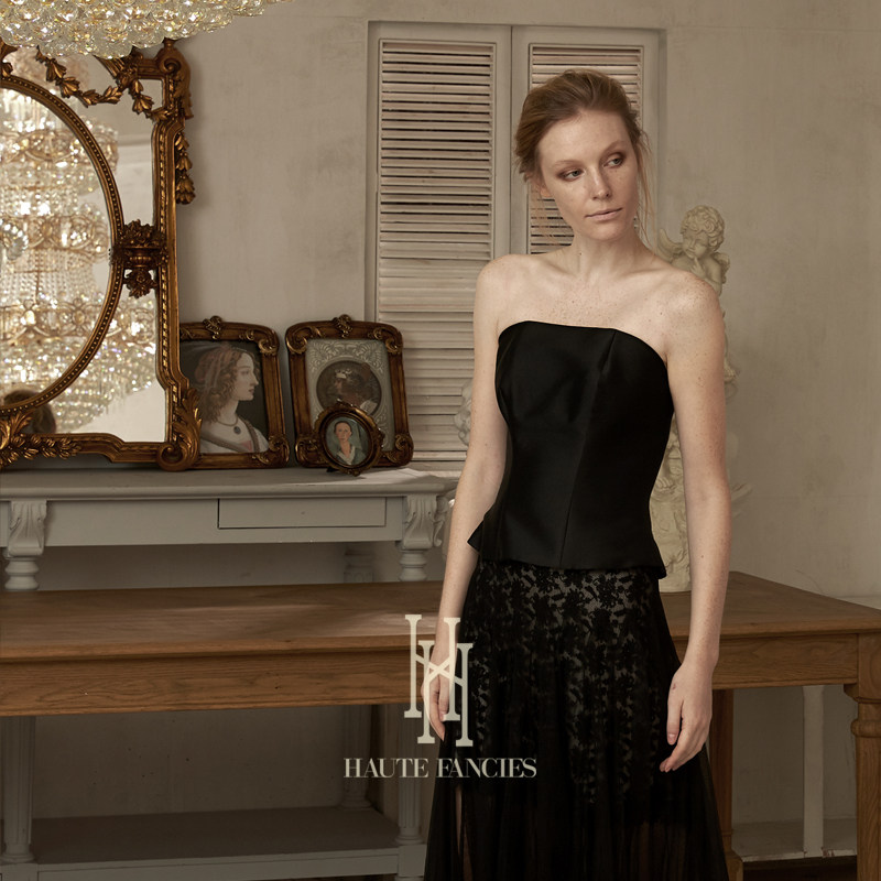 女明星 HAUTE FANCIES后构想|黑色丝毛混纺精工立裁薄纱露肩上衣