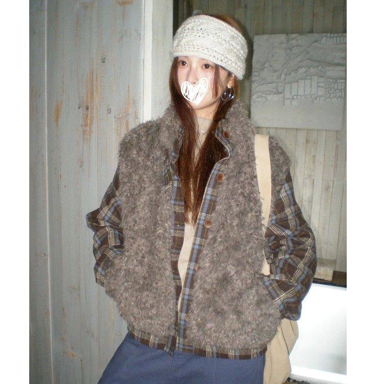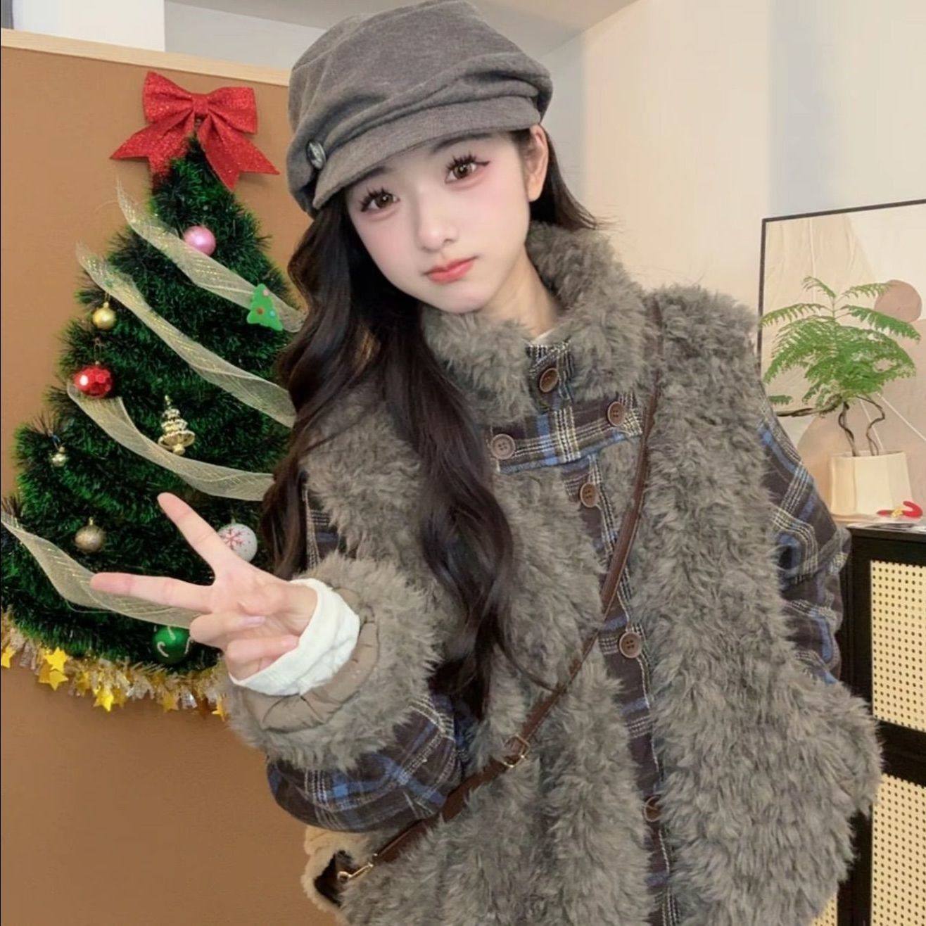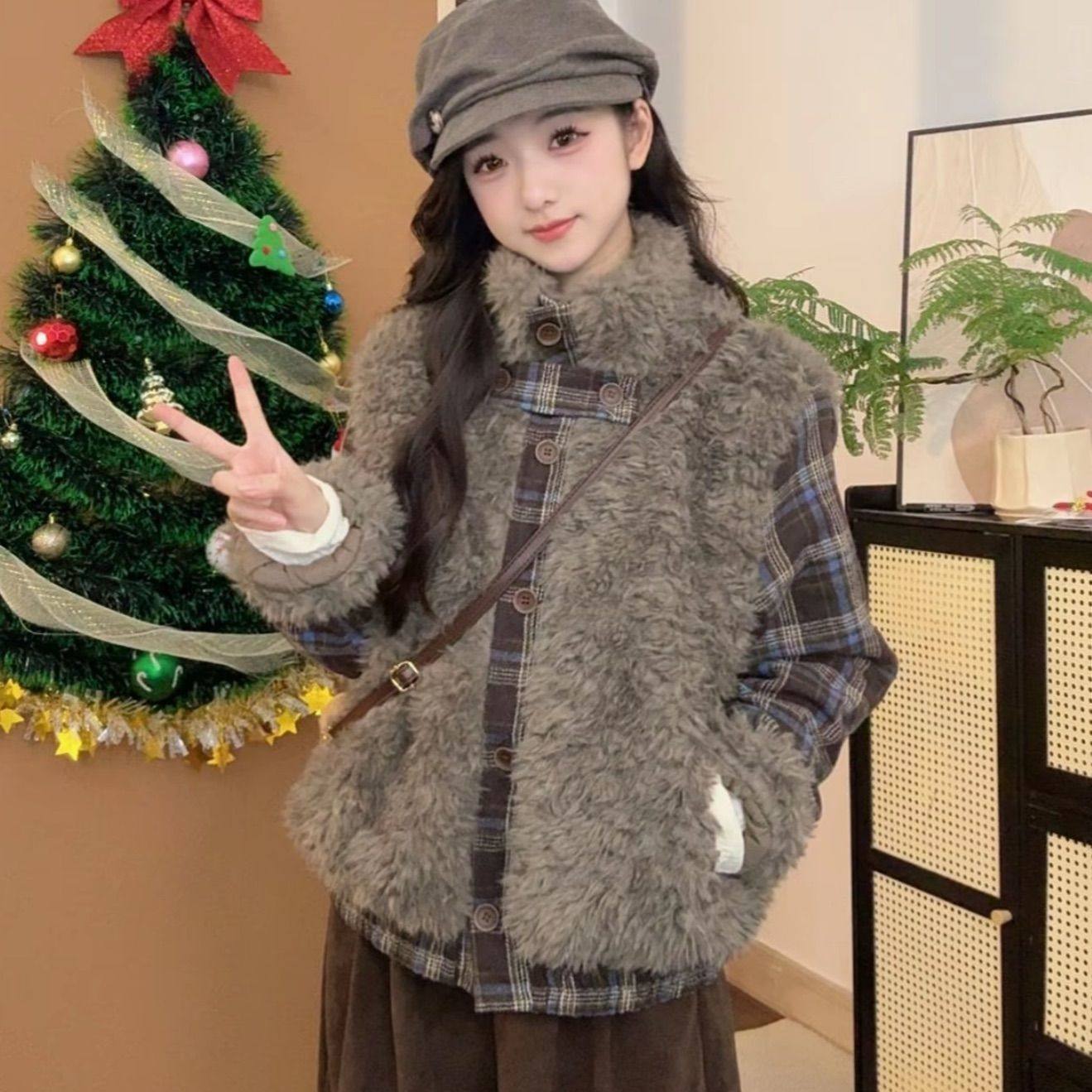 秋冬新品韩系少女宽松百搭磨毛格纹拼接毛绒外套个性时尚洋气潮流